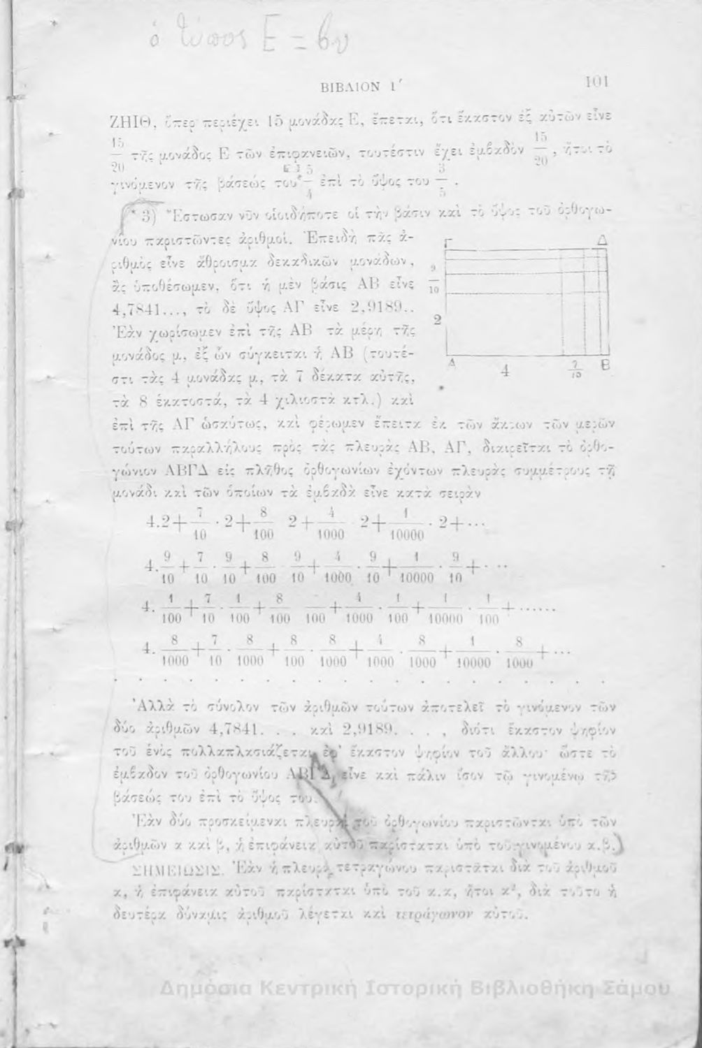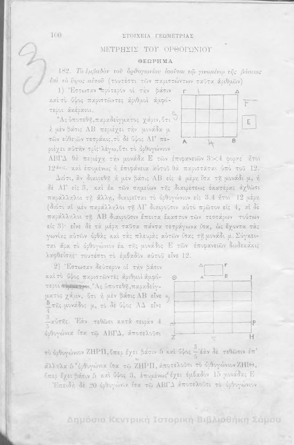 Σχολικό εγχειρίδιο Γεωμετρίας Γυμνασίου χωρισμένο σε ορισμούς, θεωρήματα, πορίσματα και ασκήσεις που εστιάζει στην Επιπεδομετρία και τη Στερεομετρία. Διαθέτει και παράρτημα με στοιχεία Αναλυτικής Γεωμετρίας.