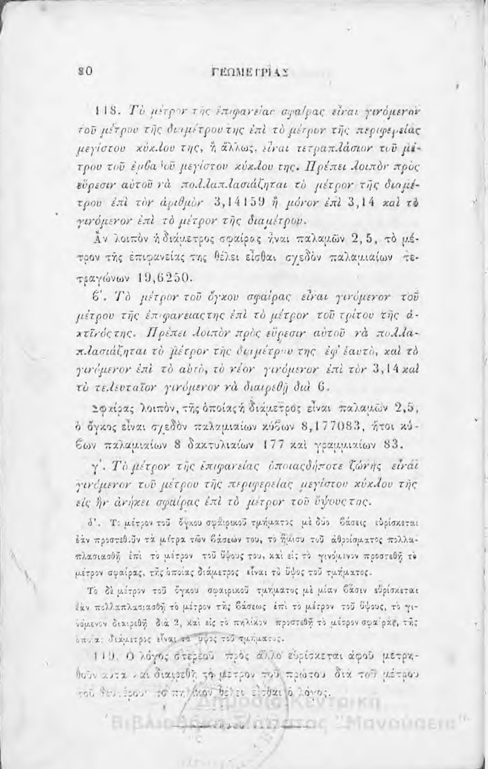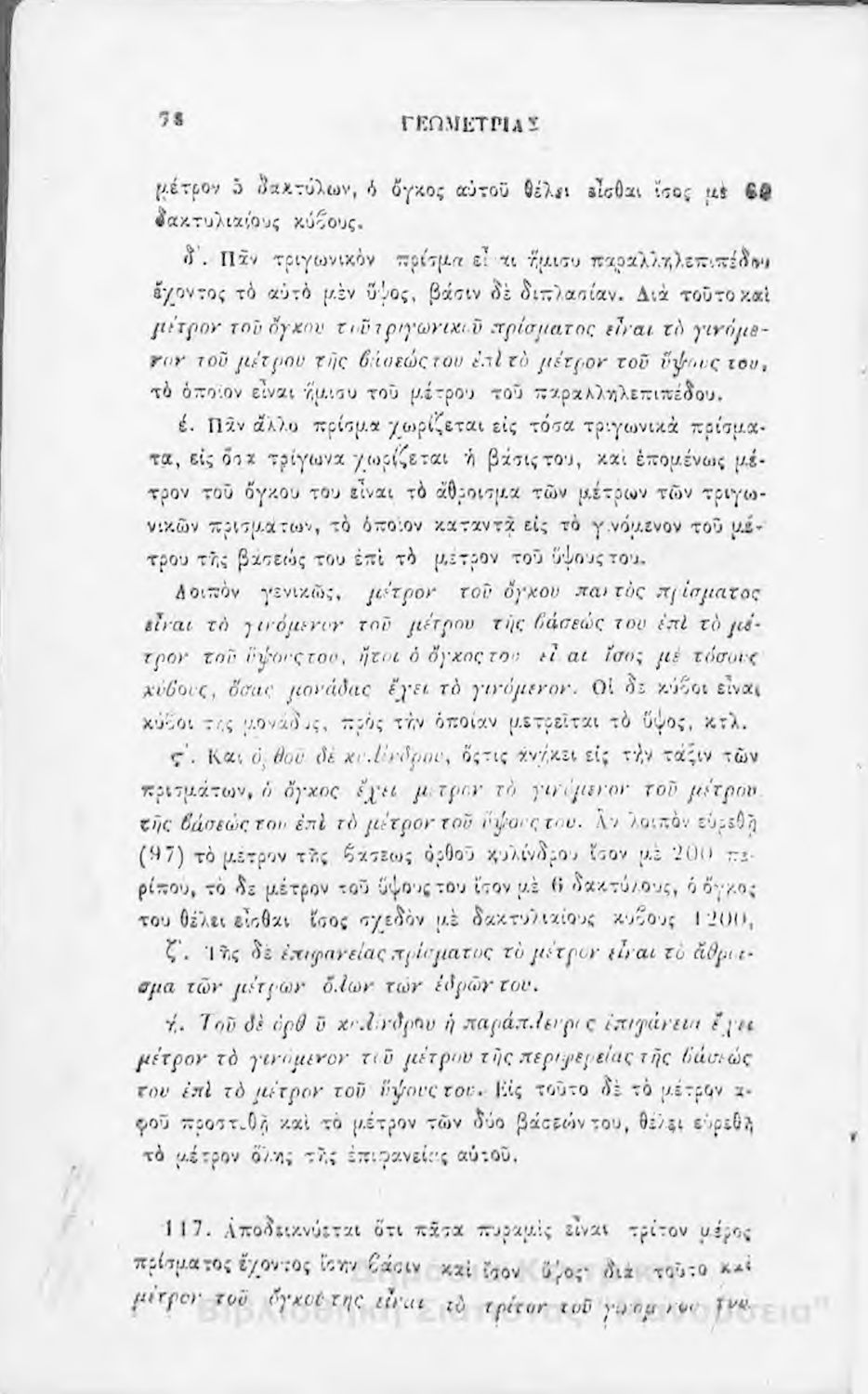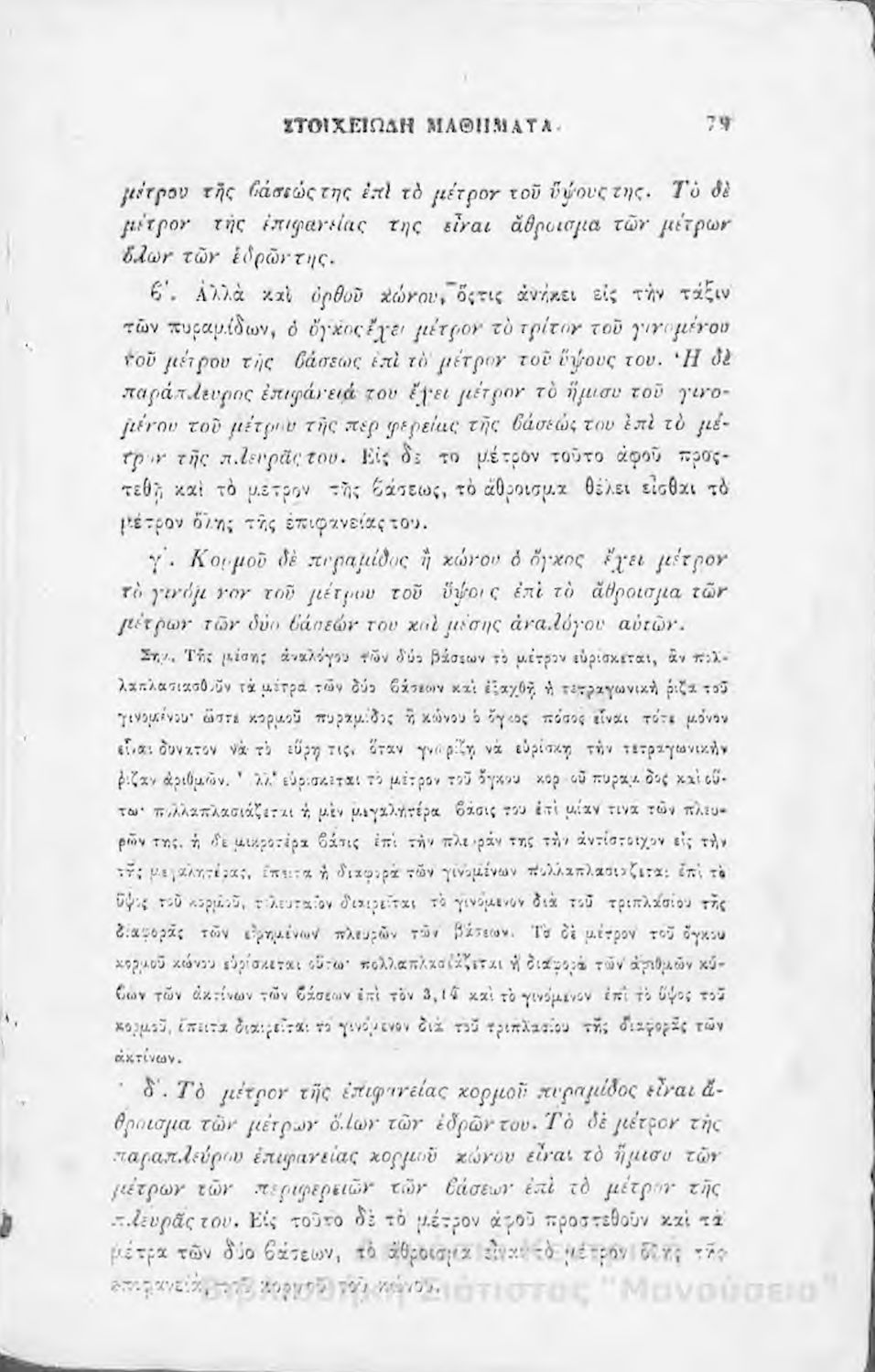 Σχολικό εγχειρίδιο Γεωμετρίας για την Α΄, Β΄ και Γ΄ τάξη των Ελληνικών και Αστικών Σχολείων και Παρθεναγωγείων που είναι χωρισμένο σε Επιπεδομετρία και Στερεομετρία και περιλαμβάνει θεωρία και ασκήσεις.