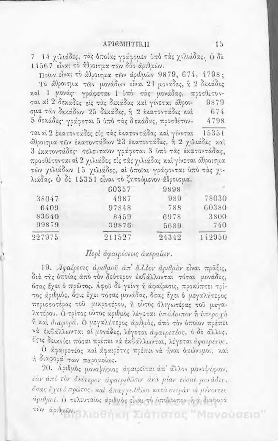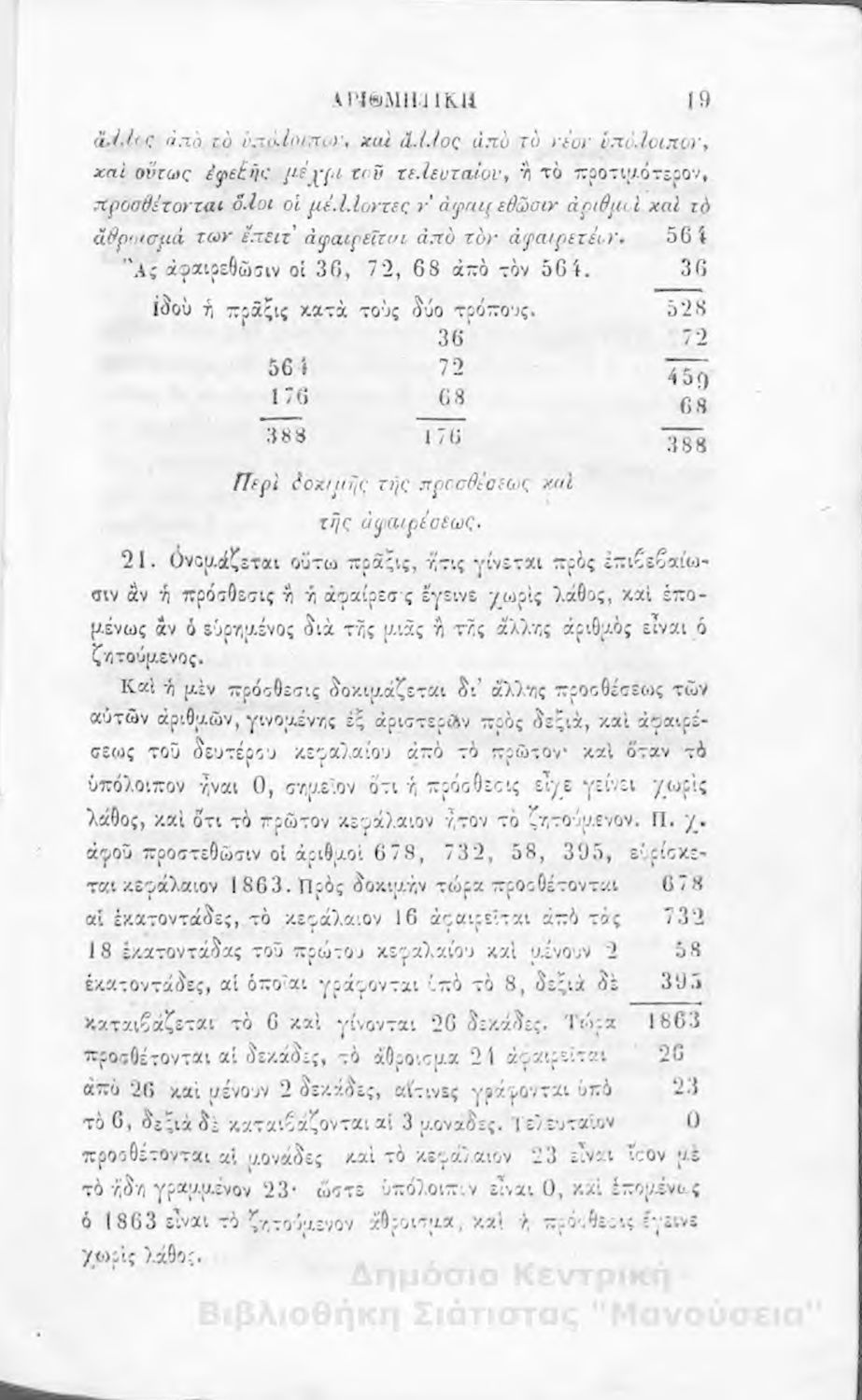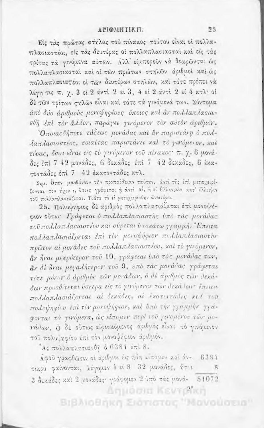 Σχολικό εγχειρίδιο Αριθμητικής που εστιάζει στις αριθμητικές πράξεις και τις εφαρμογές τους. Ο συγγραφέας κρίνει την αναλυτική μέθοδο ως προσφορότερη για την Στοιχειώδη Εκπαίδευση και εκθειάζει τον "από μνήμης