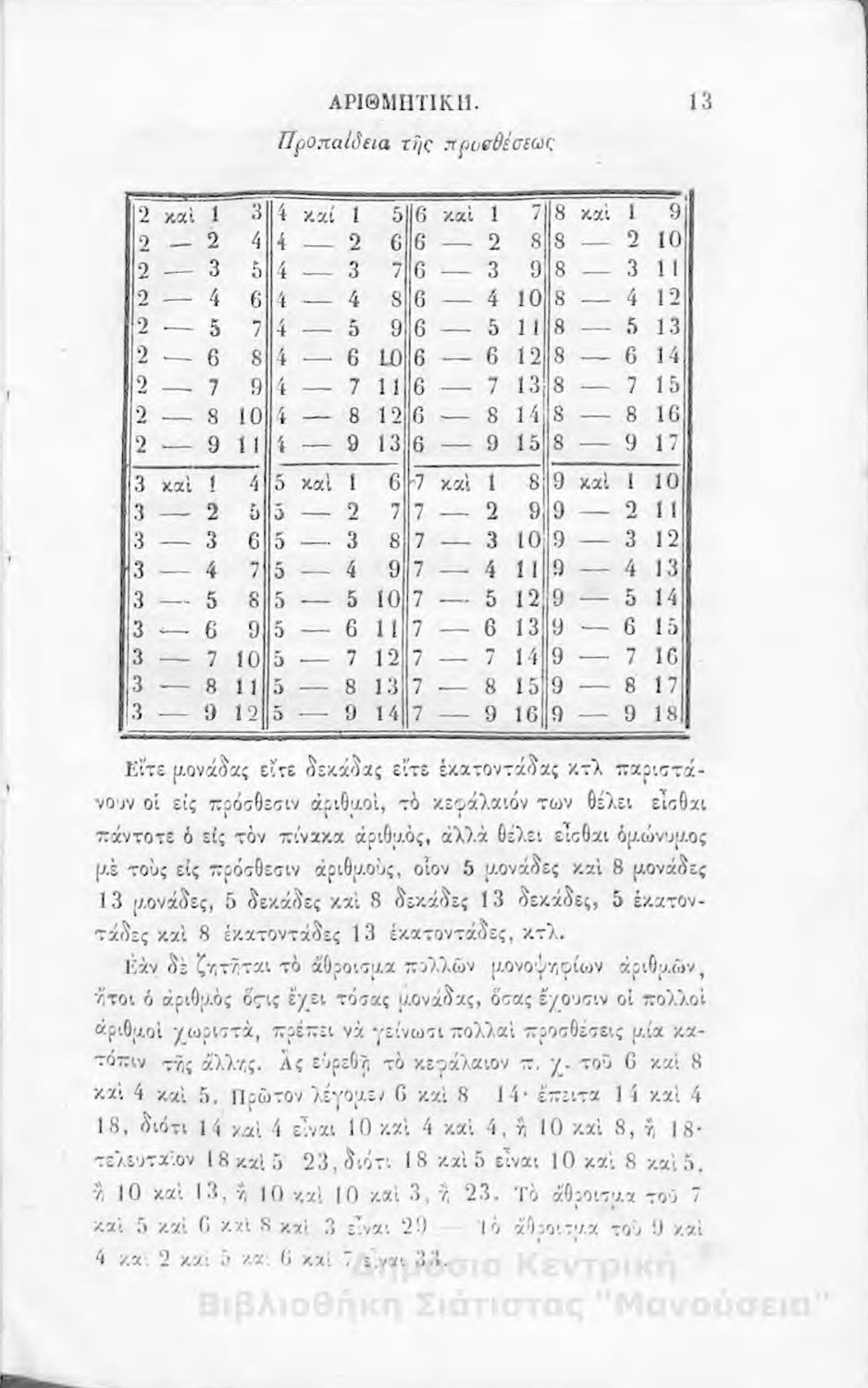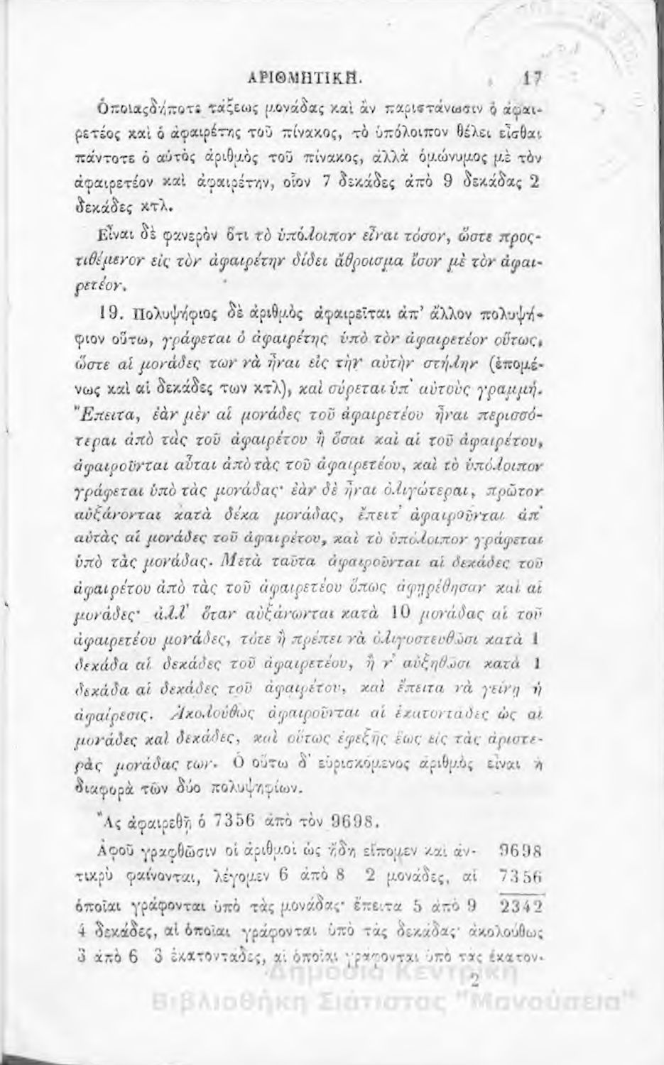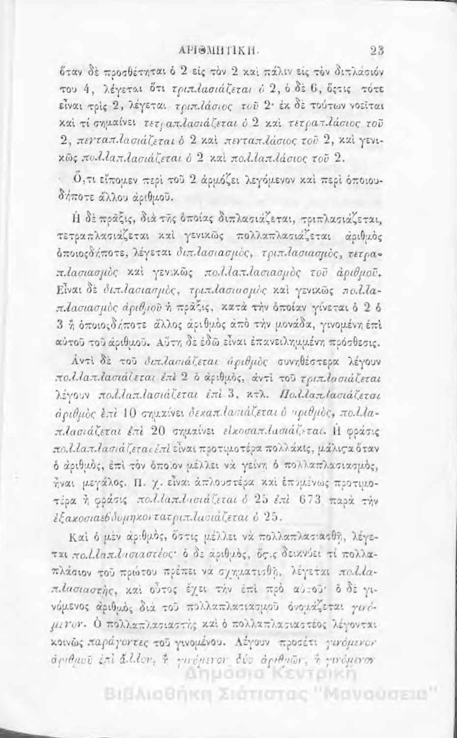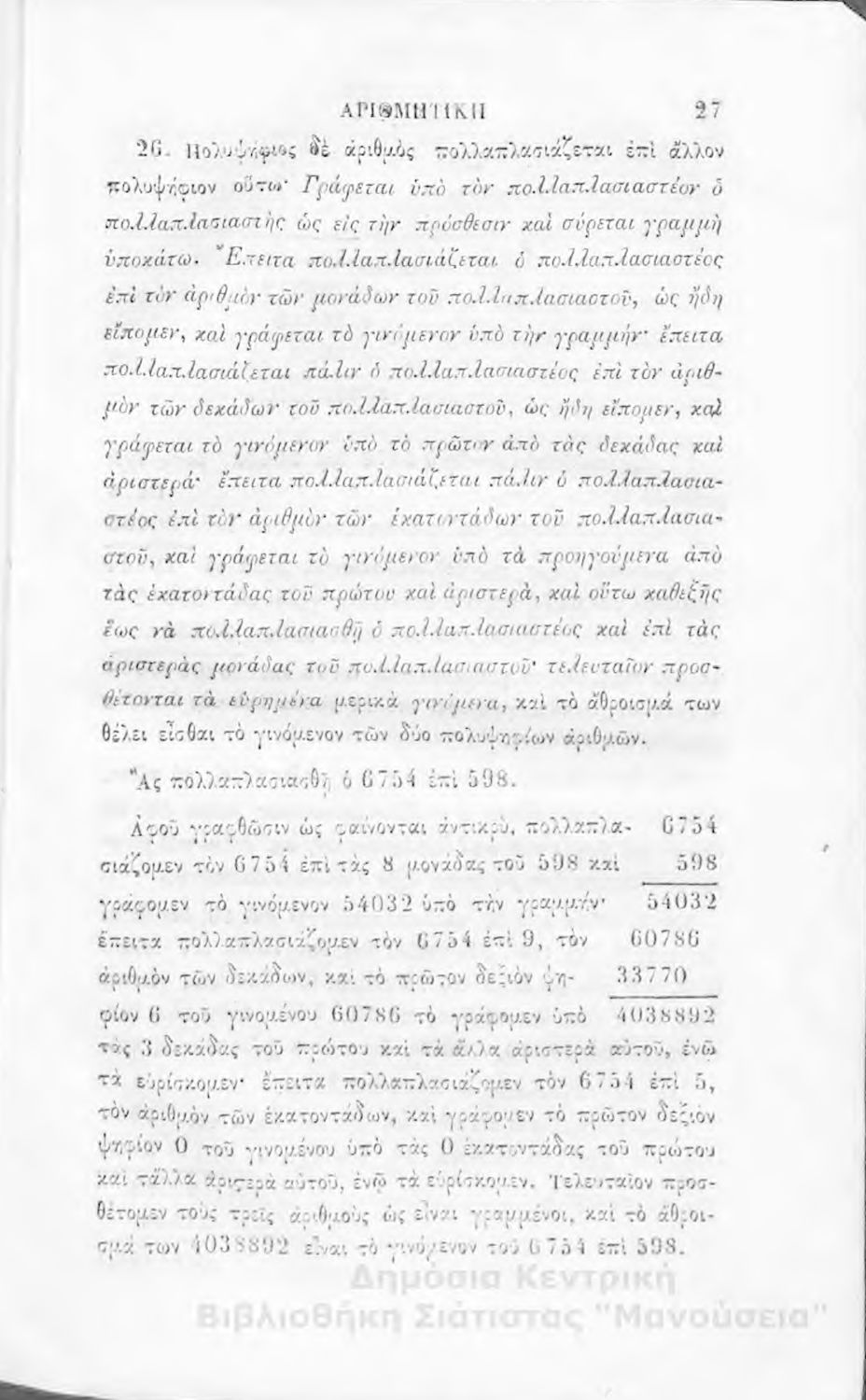 Σχολικό εγχειρίδιο Αριθμητικής που εστιάζει στις αριθμητικές πράξεις και τις εφαρμογές τους. Ο συγγραφέας κρίνει την αναλυτική μέθοδο ως προσφορότερη για την Στοιχειώδη Εκπαίδευση και εκθειάζει τον "από μνήμης