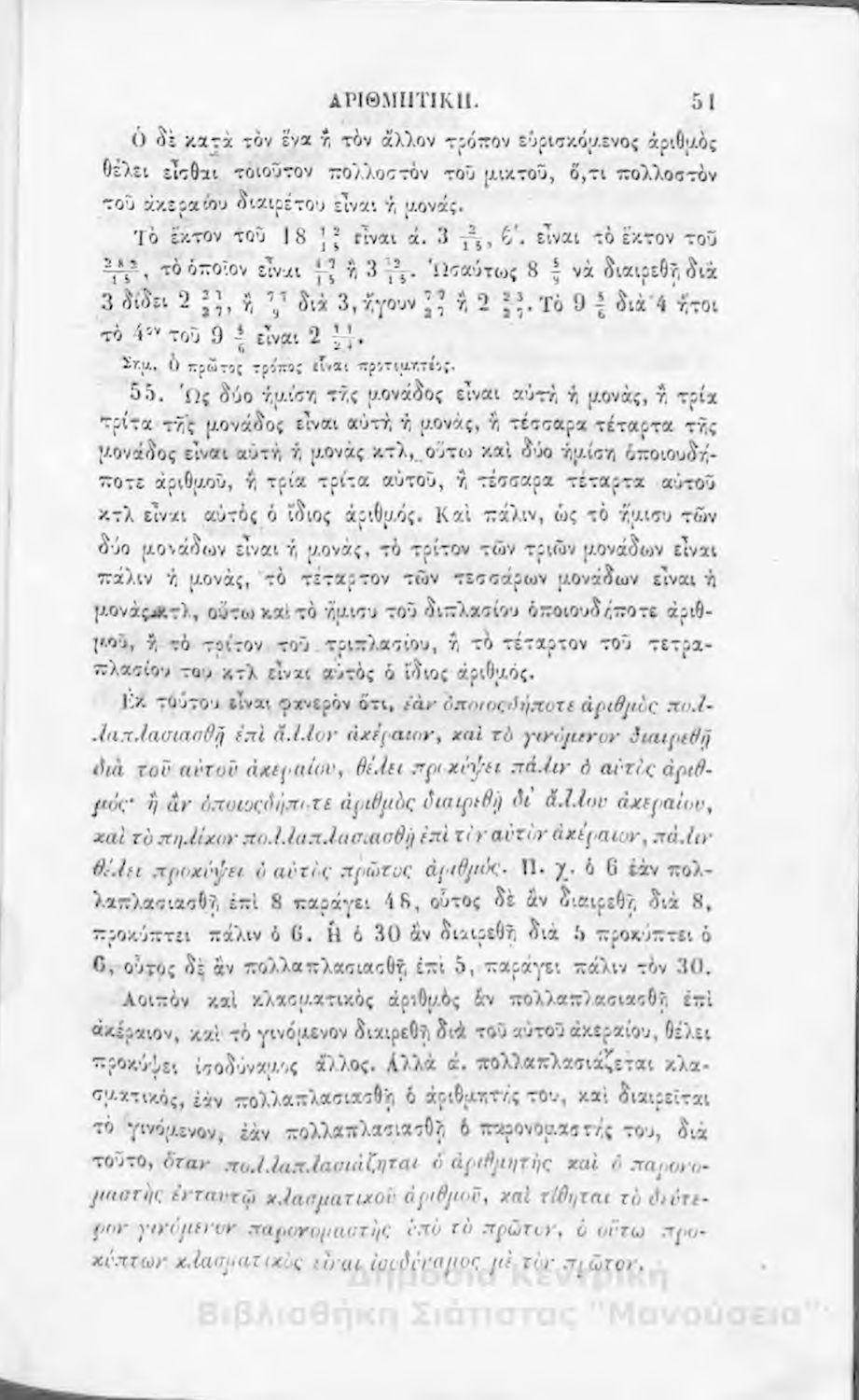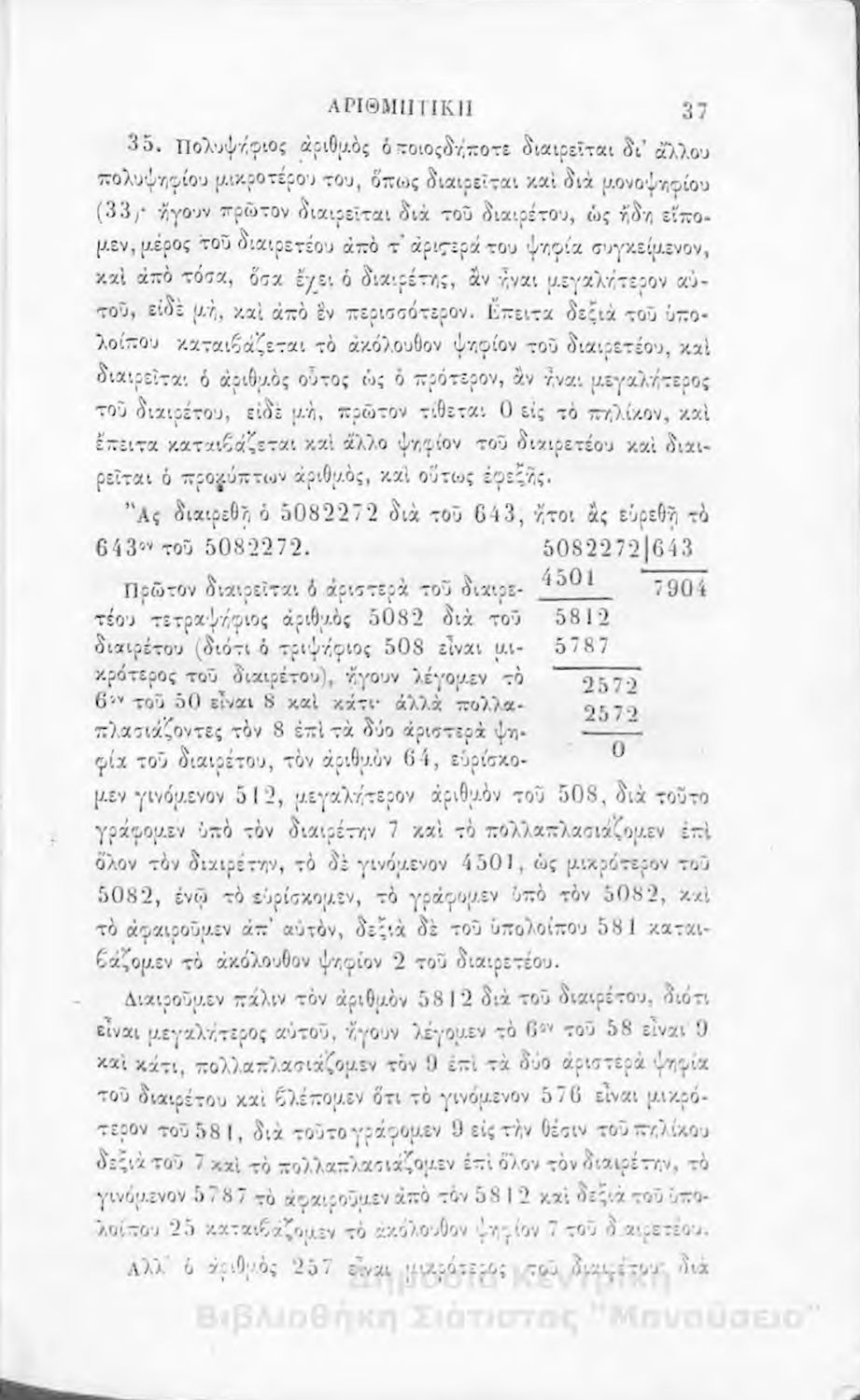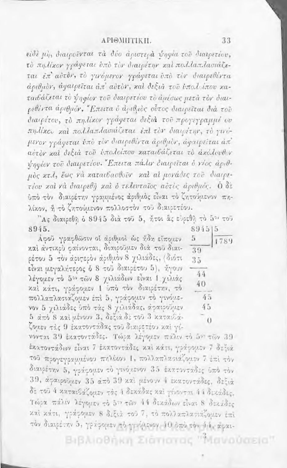 Σχολικό εγχειρίδιο Αριθμητικής που εστιάζει στις αριθμητικές πράξεις και τις εφαρμογές τους. Ο συγγραφέας κρίνει την αναλυτική μέθοδο ως προσφορότερη για την Στοιχειώδη Εκπαίδευση και εκθειάζει τον "από μνήμης