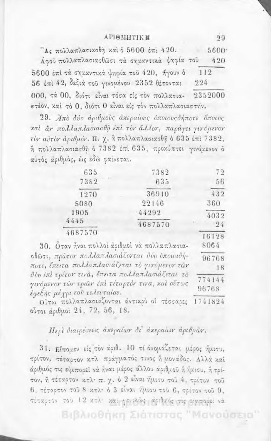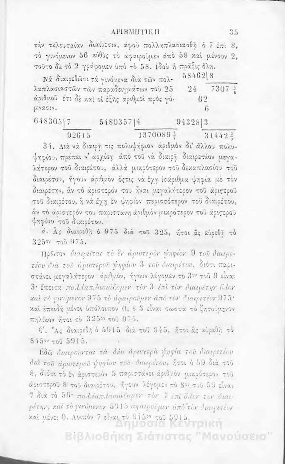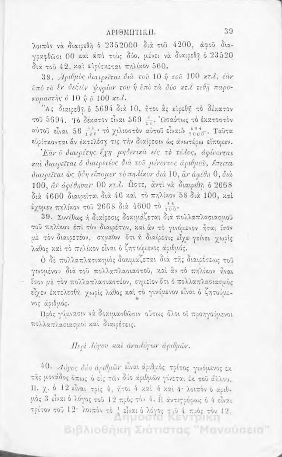 Σχολικό εγχειρίδιο Αριθμητικής που εστιάζει στις αριθμητικές πράξεις και τις εφαρμογές τους. Ο συγγραφέας κρίνει την αναλυτική μέθοδο ως προσφορότερη για την Στοιχειώδη Εκπαίδευση και εκθειάζει τον "από μνήμης