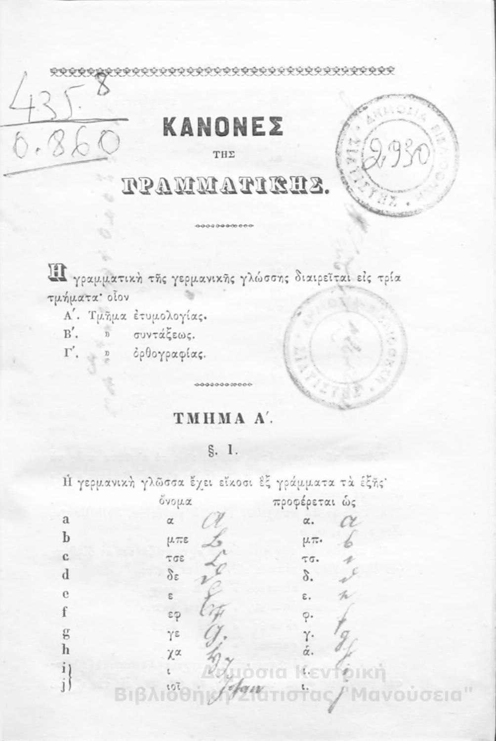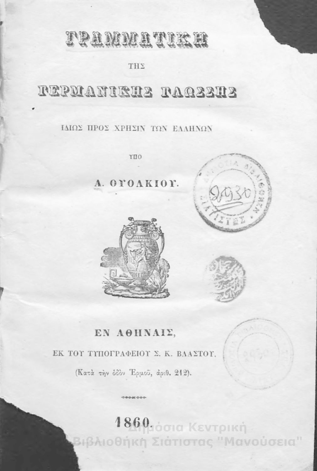 Εκδότης: Εκ του τυπογραφείου Σ. Κ. Βλαστού Έτος έκδοσης: 1860 Τόπος έκδοσης: Εν Αθήναις |