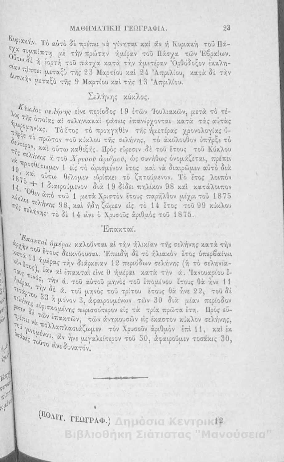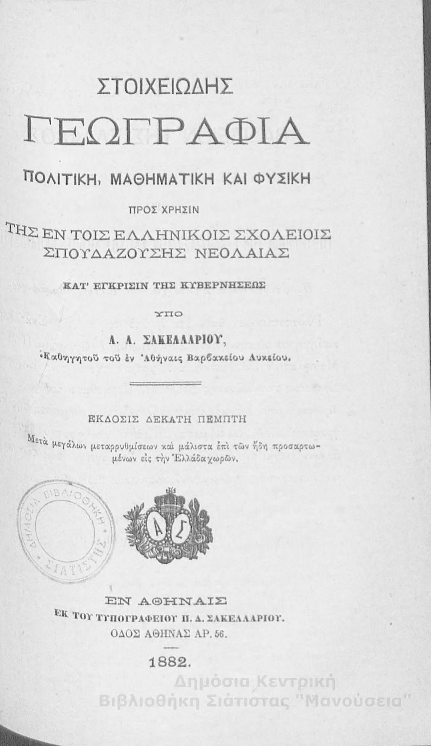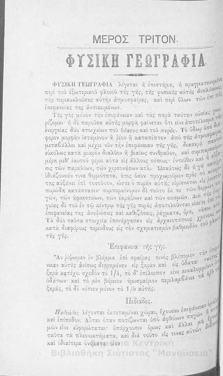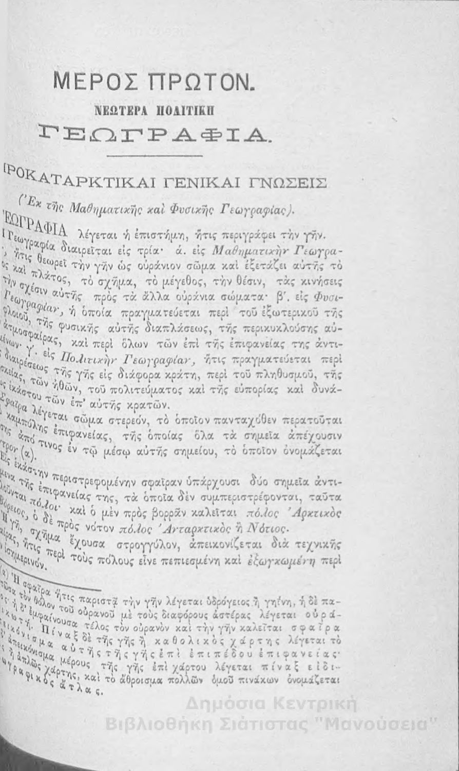 Στοιχειώδης γεωγραφία πολιτική μαθηματική και φυσική: προς χρήσιν της εν τοις ελληνικοίς σχολείοις σπουδαζούσης νεολαίας