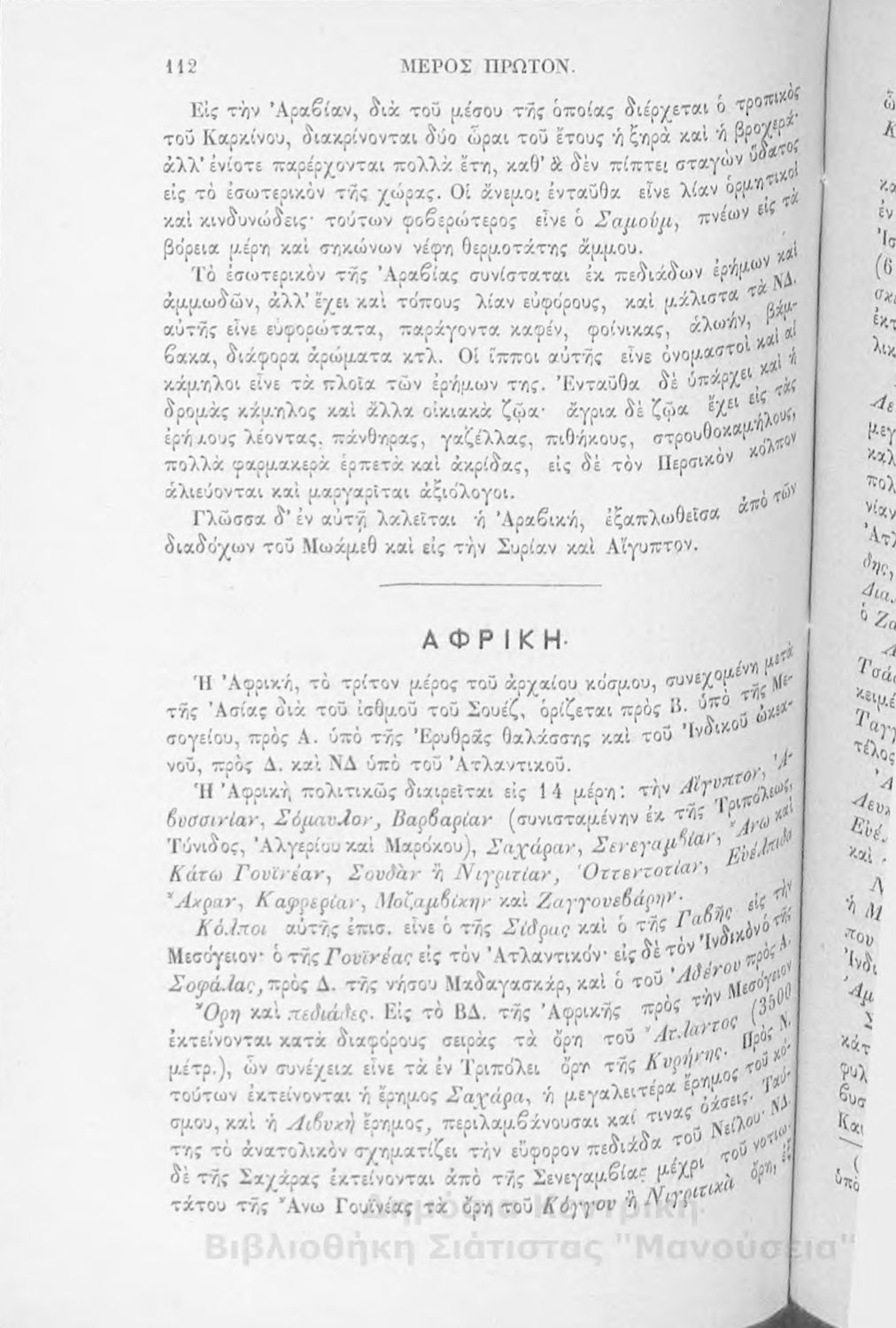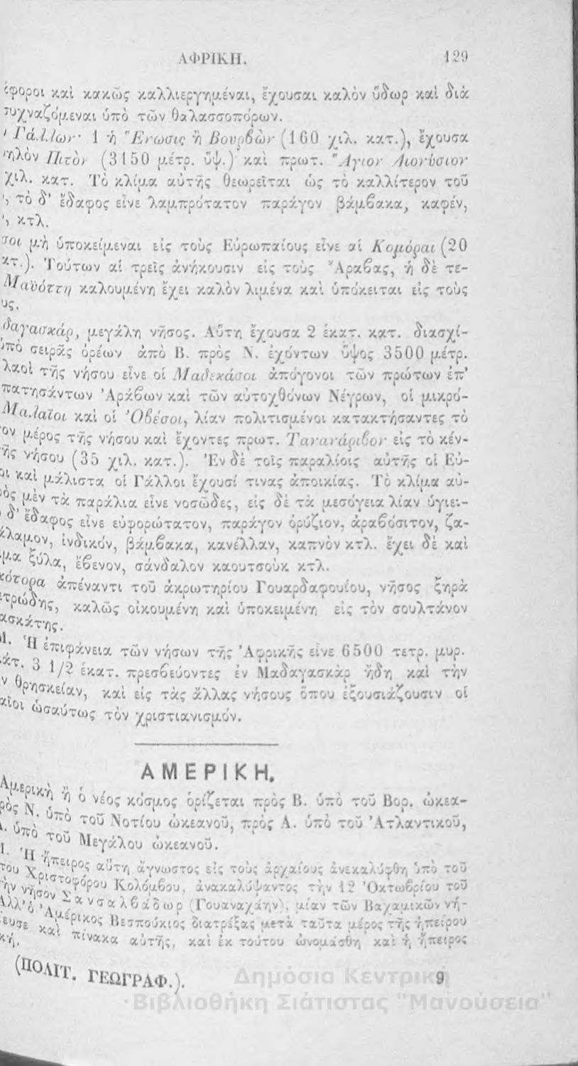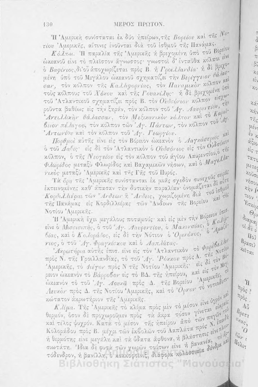 Σχολικό εγχειρίδιο Γεωγραφίας για τα Ελληνικά Σχολεία που περιλαμβάνει εισαγωγή στις βασικές έννοιες και ορισμούς της επιστήμης, και στοιχεία μαθηματικής, φυσικής και πολιτικής γεωγραφίας των πέντε ηπείρων.