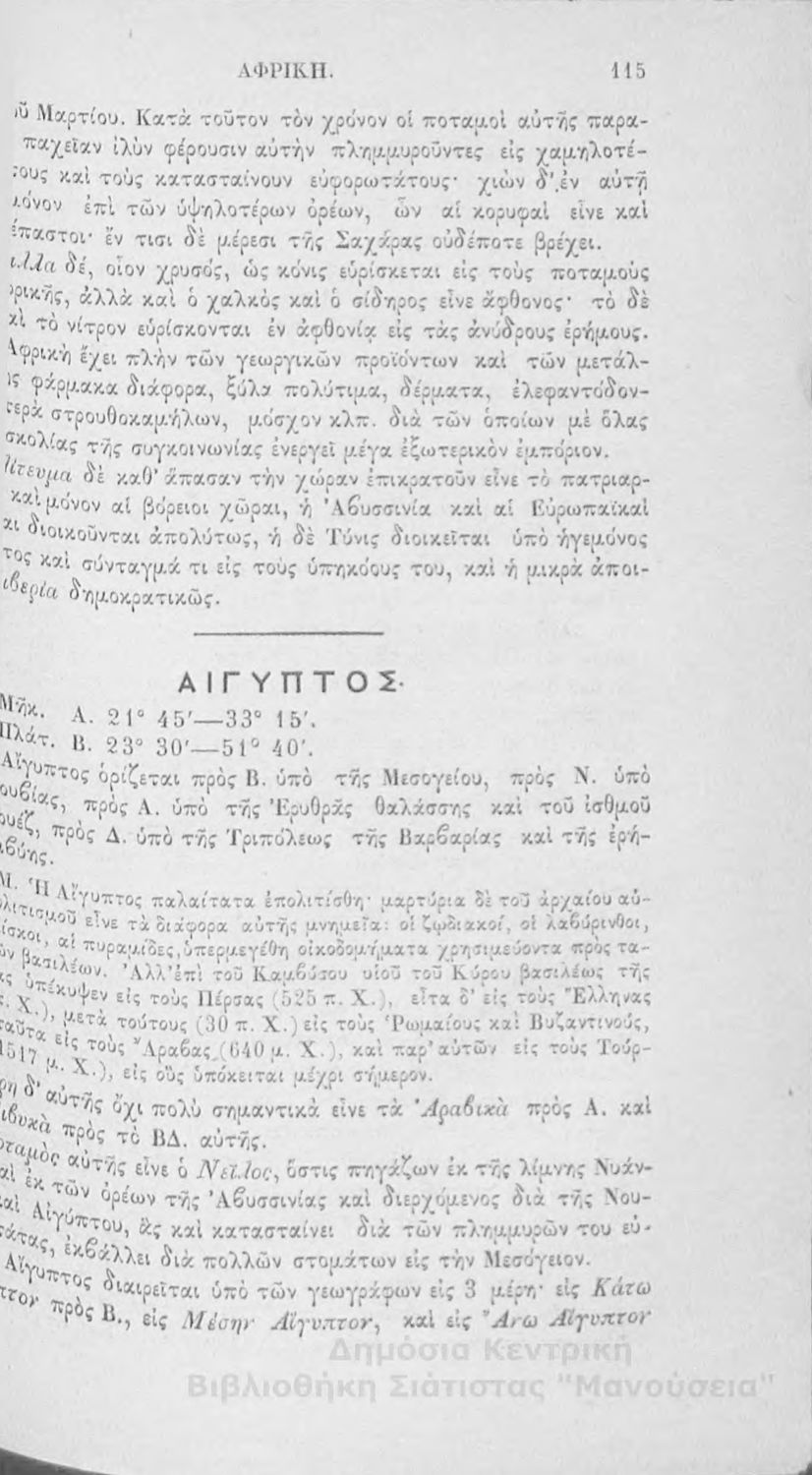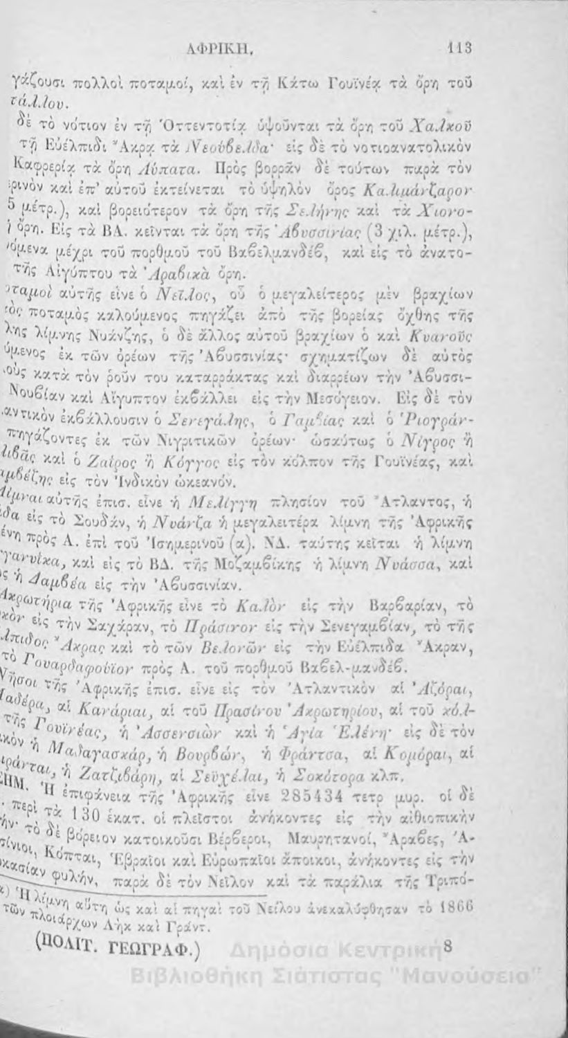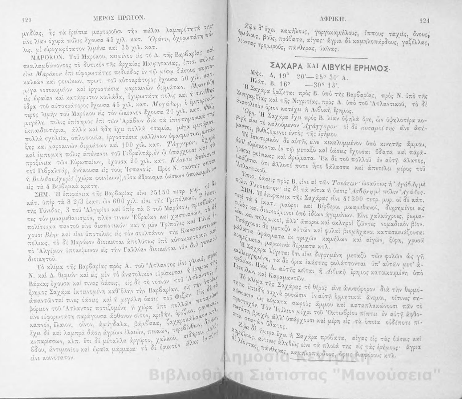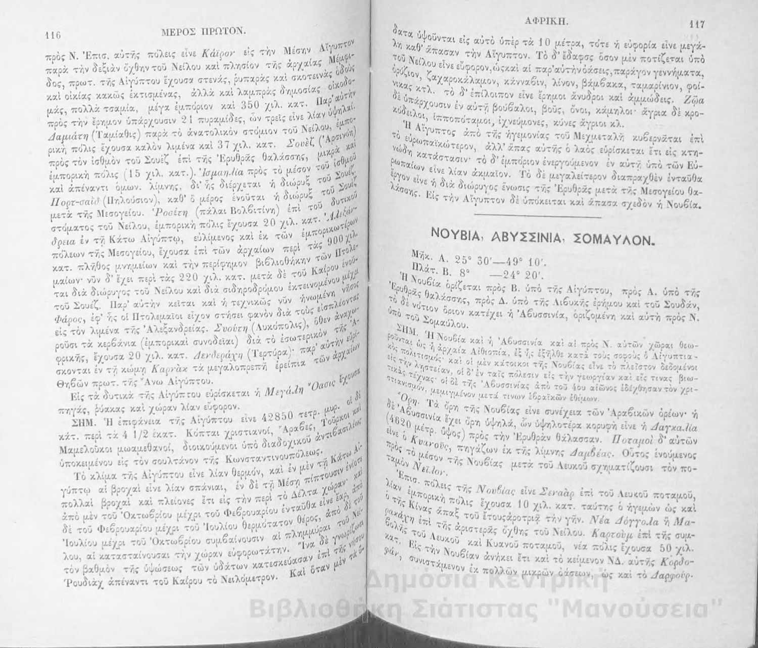 Σχολικό εγχειρίδιο Γεωγραφίας για τα Ελληνικά Σχολεία που περιλαμβάνει εισαγωγή στις βασικές έννοιες και ορισμούς της επιστήμης, και στοιχεία μαθηματικής, φυσικής και πολιτικής γεωγραφίας των πέντε ηπείρων.