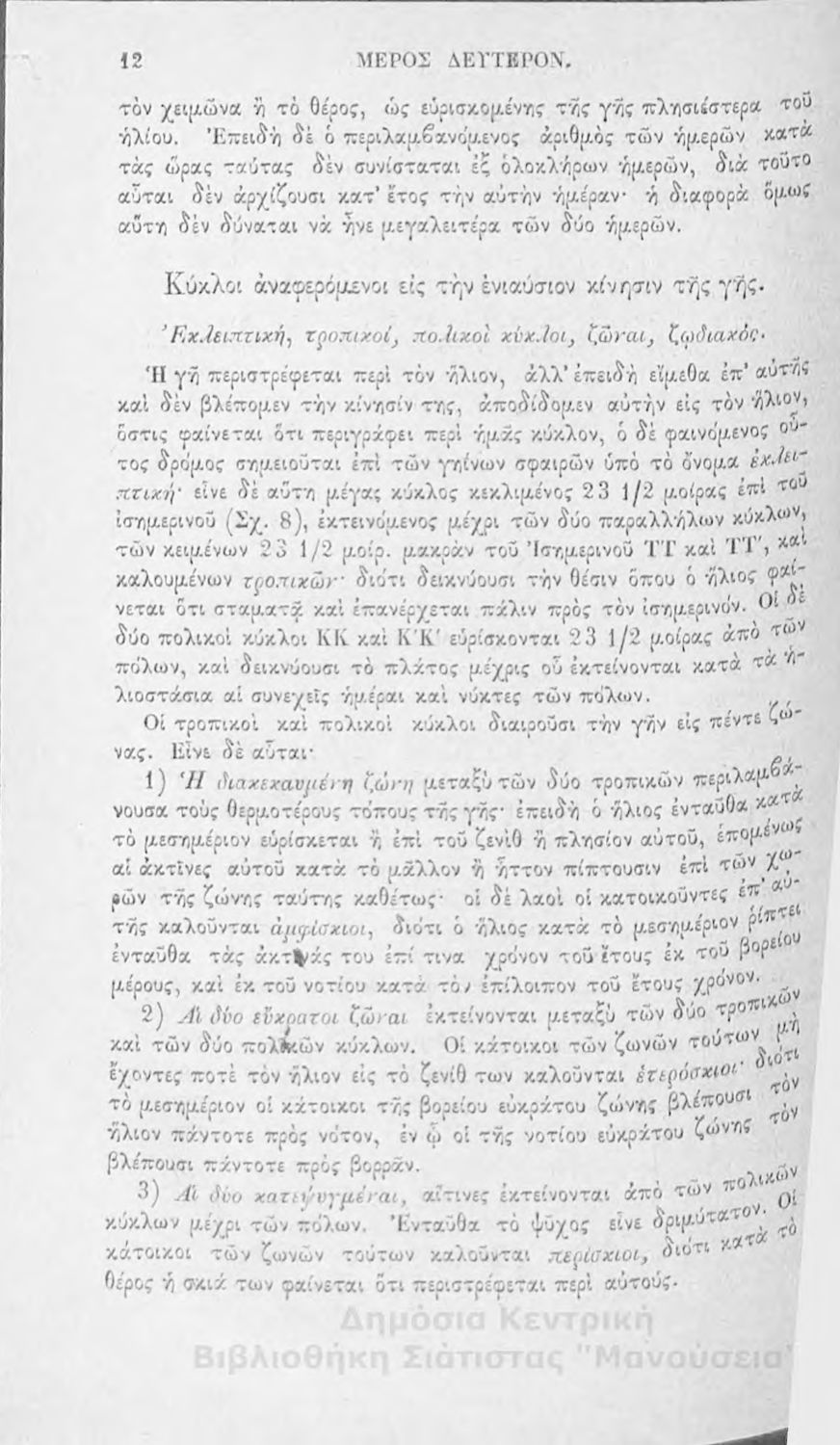 Σχολικό εγχειρίδιο Γεωγραφίας για τα Ελληνικά Σχολεία που περιλαμβάνει εισαγωγή στις βασικές έννοιες και ορισμούς της επιστήμης, και στοιχεία μαθηματικής, φυσικής και πολιτικής γεωγραφίας των πέντε ηπείρων.