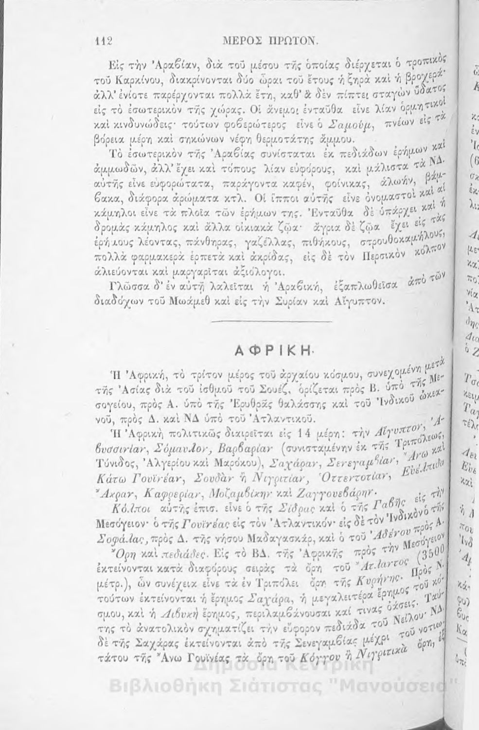 Σχολικό εγχειρίδιο Γεωγραφίας για τα Ελληνικά Σχολεία που περιλαμβάνει εισαγωγή στις βασικές έννοιες και ορισμούς της επιστήμης, και στοιχεία μαθηματικής, φυσικής και πολιτικής γεωγραφίας των πέντε ηπείρων.