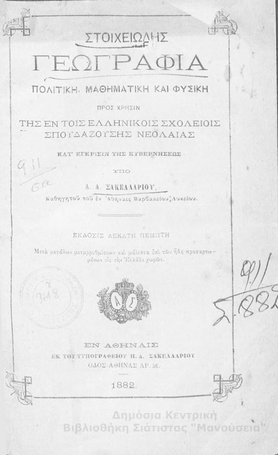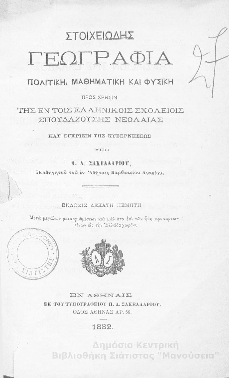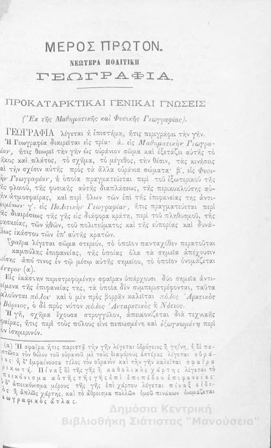 Στοιχειώδης γεωγραφία πολιτική μαθηματική και φυσική: προς χρήσιν της εν τοις ελληνικοίς σχολείοις σπουδαζούσης νεολαίας