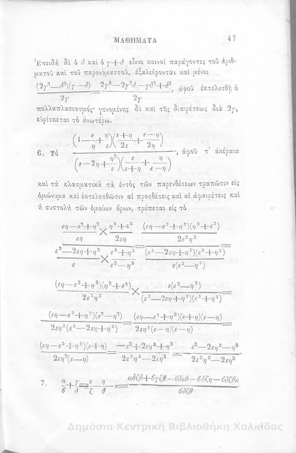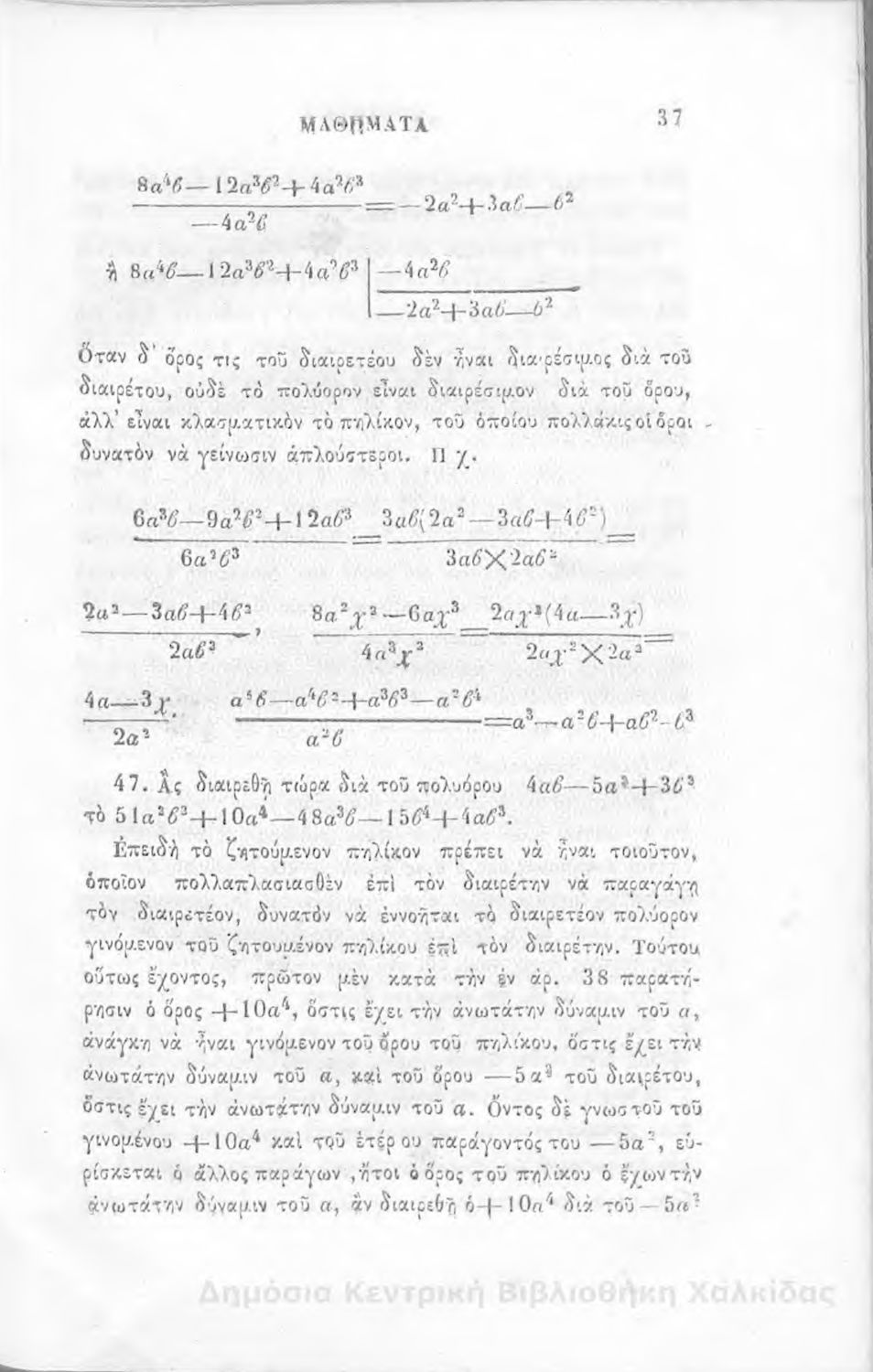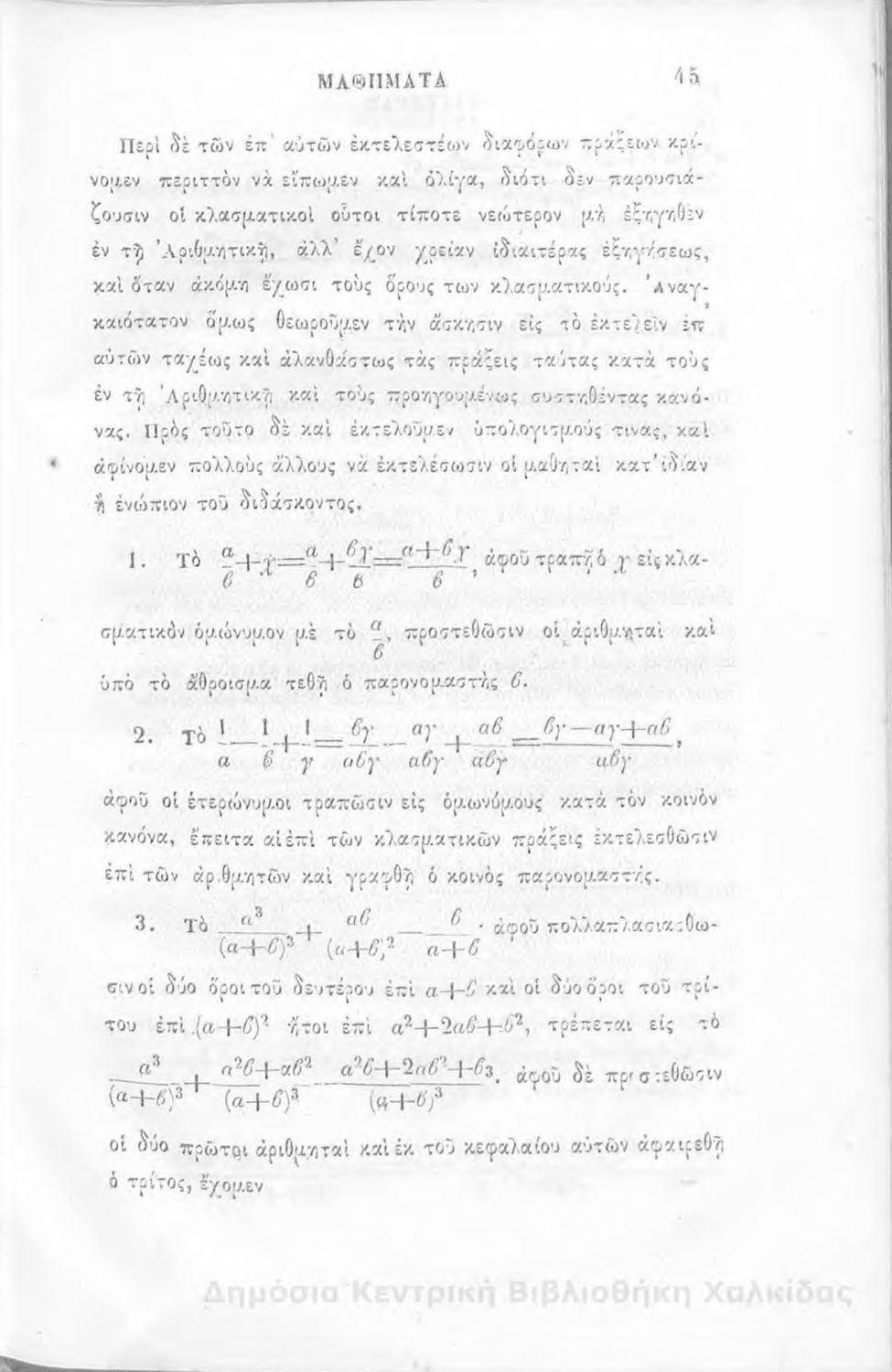 Σχολικό εγχειρίδιο για τις τάξεις του Γυμνασίου για το μάθημα των Μαθηματικών και συγκεκριμένα της Άλγεβρας. Το εγχειρίδιο περιλαμβάνει εισαγωγικά γενικές πληροφορίες για τις 4 βασικές πράξεις συνεχίζει με τις