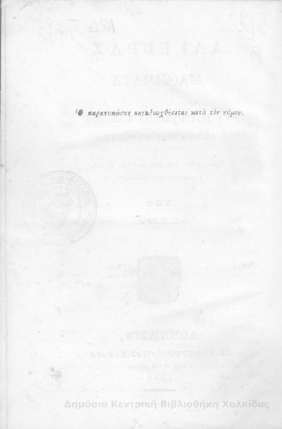 Εκδότης: Εκ της τυπογραφίας Κ. Βαφά Έτος έκδοσης: 1846 |