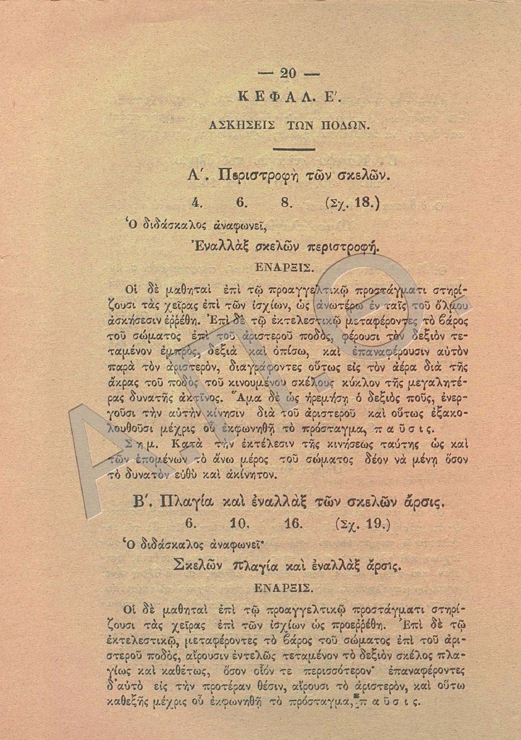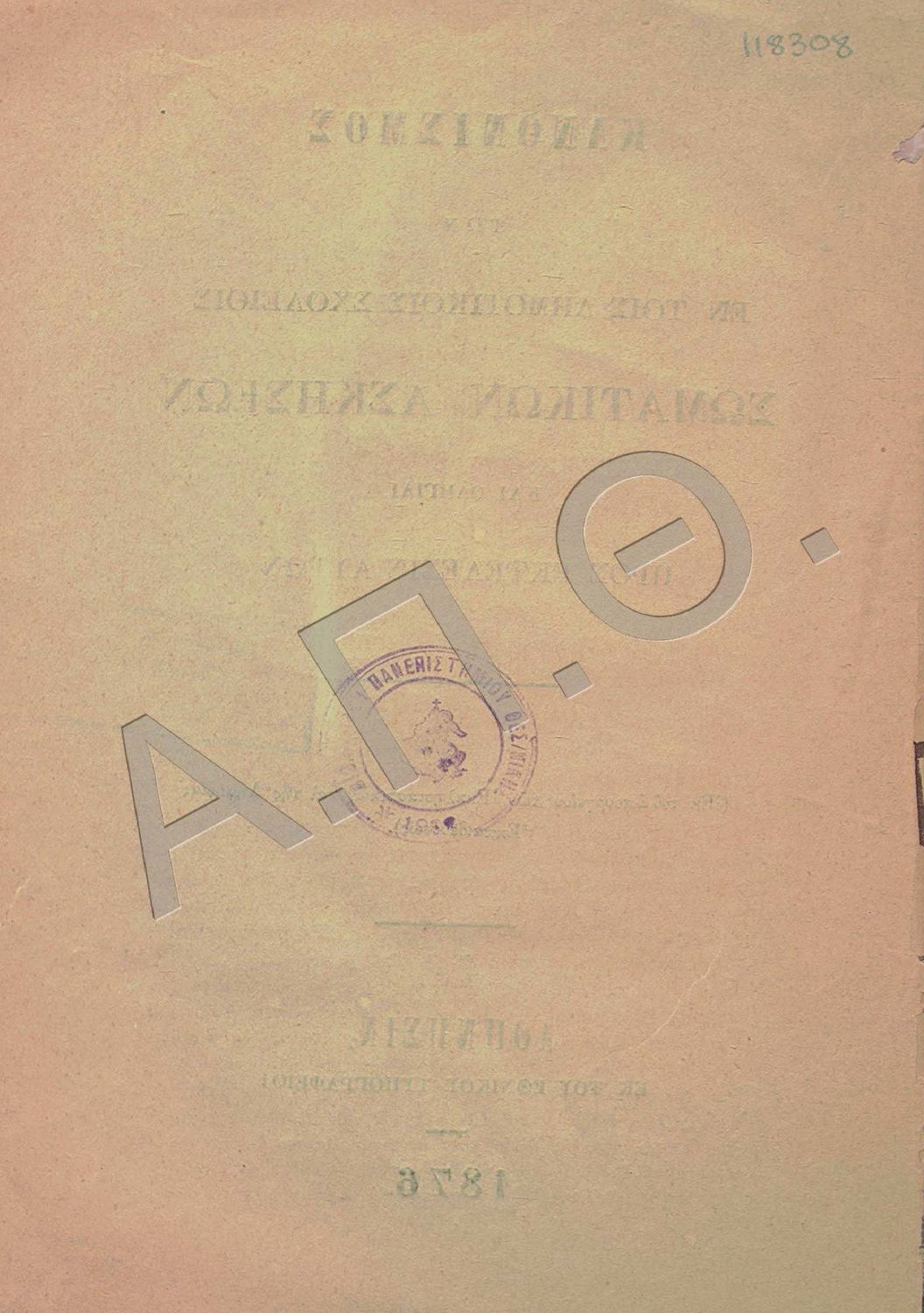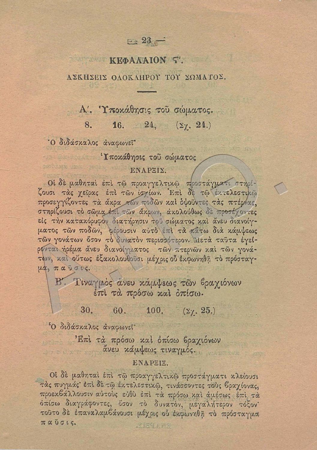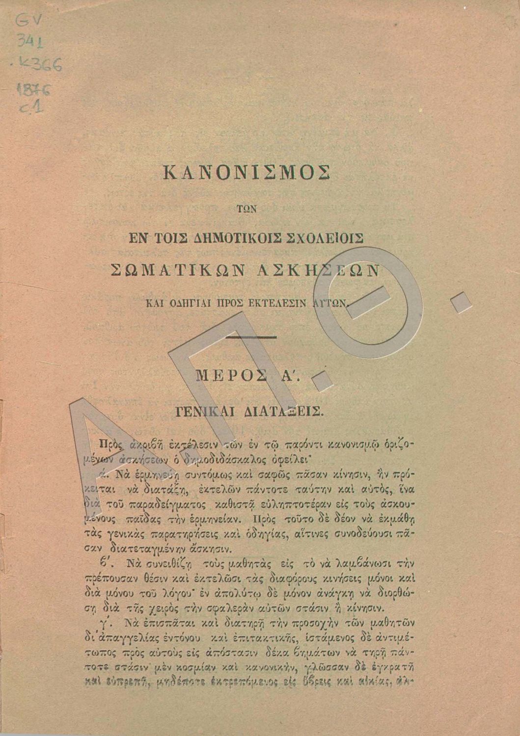 Κωδικός αναγνώρισης: 1876-0003 Τίτλος: Κανονισμός των εν τοις δημοτικοίς σχολείοις σωματικών ασκήσεων και οδηγίαι προς εκτέλεσιν αυτών Μέγεθος και υπόστρωμα: Λοιπά προγραμμάτων σπουδών, 38 σελίδες. |