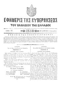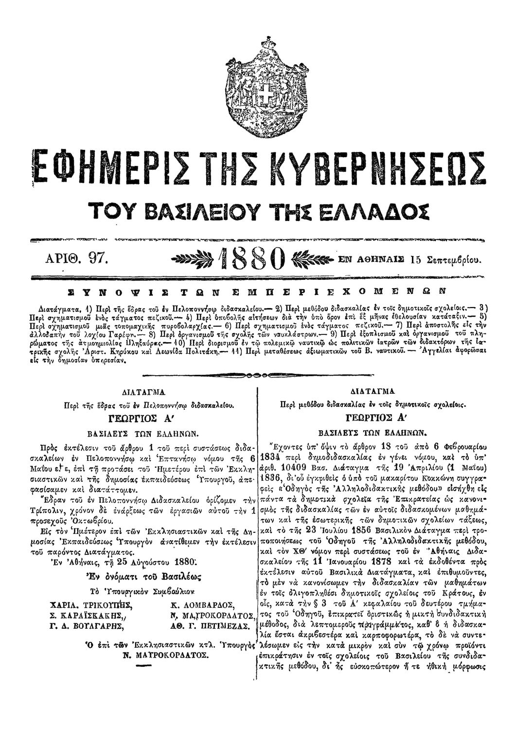 Κωδικός αναγνώρισης: 1880-097A Τίτλος: ΦΕΚ 97/15.09.1880, Τεύχος Α Μέγεθος και υπόστρωμα: Φεκ προγραμμάτων σπουδών, 2 σελίδες. |