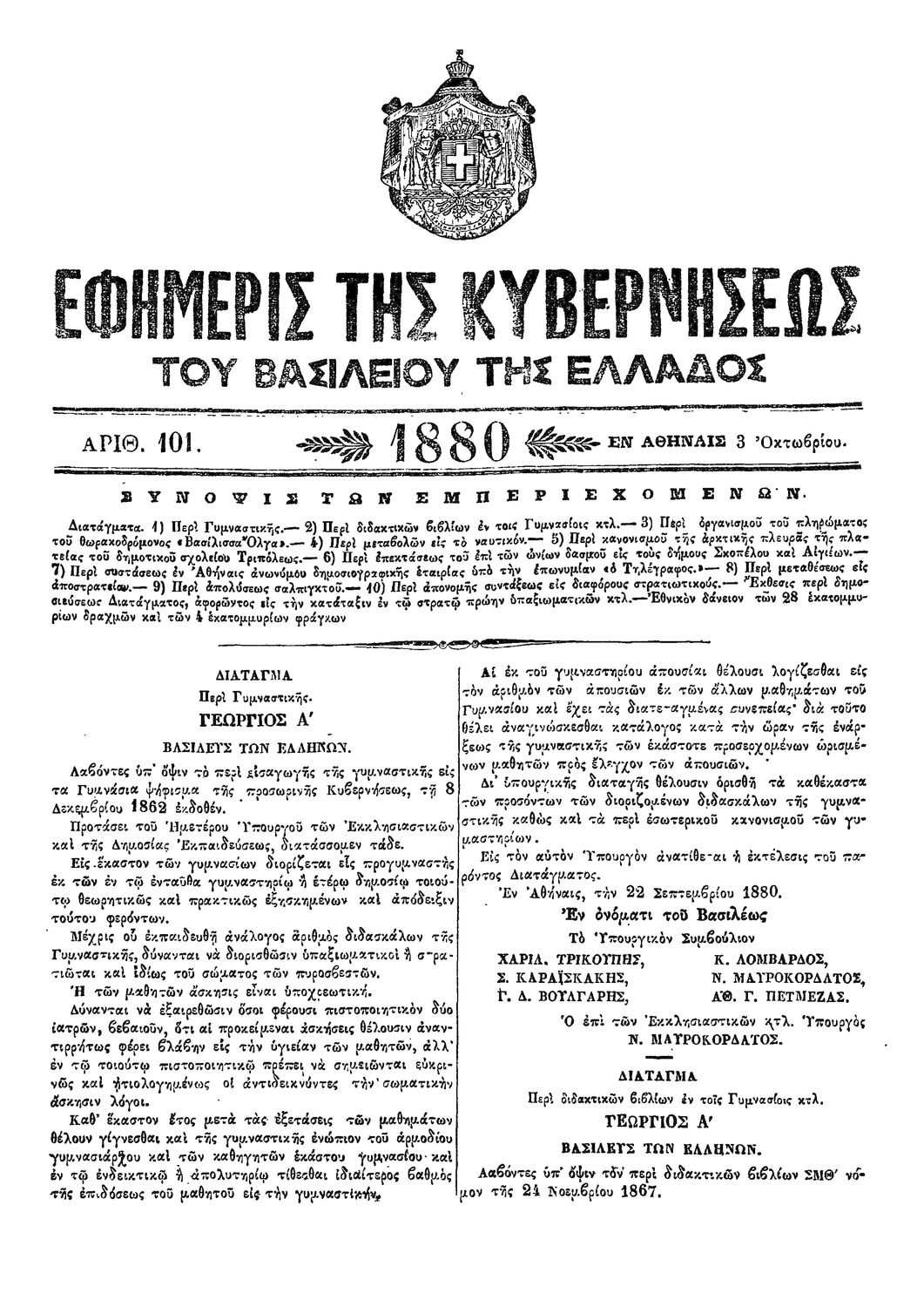 Κωδικός αναγνώρισης: 1880-101A Τίτλος: ΦΕΚ 101/03.10.1880, Τεύχος Α Μέγεθος και υπόστρωμα: Φεκ προγραμμάτων σπουδών, 1 σελίδες. |
