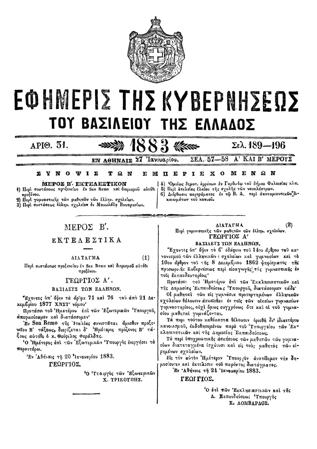 Ε.Δ. Περί γυμναστικής των μαθητών των ελλην. σχολείων