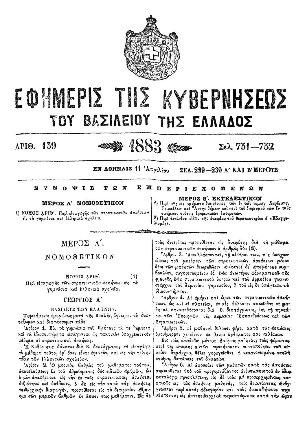 Κωδικός αναγνώρισης: 1883-139A Τίτλος: ΦΕΚ 139/11.04.1883, Τεύχος Α Μέγεθος και υπόστρωμα: Φεκ προγραμμάτων σπουδών, 1 σελίδες. |