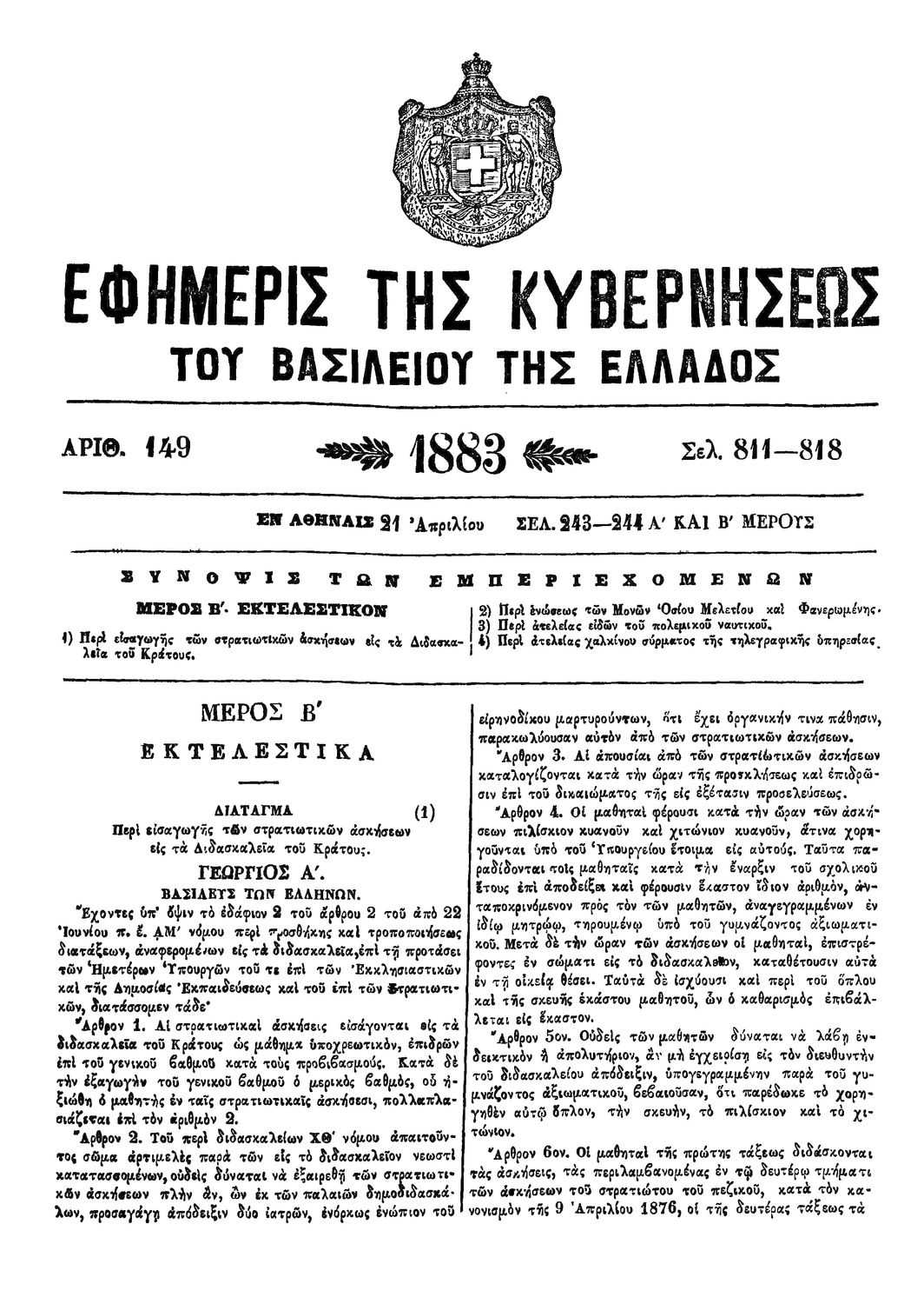 Ε.Δ. Περί εισαγωγής των στρατιωτικών ασκήσεων εις τα Διδασκαλεία του Κράτους