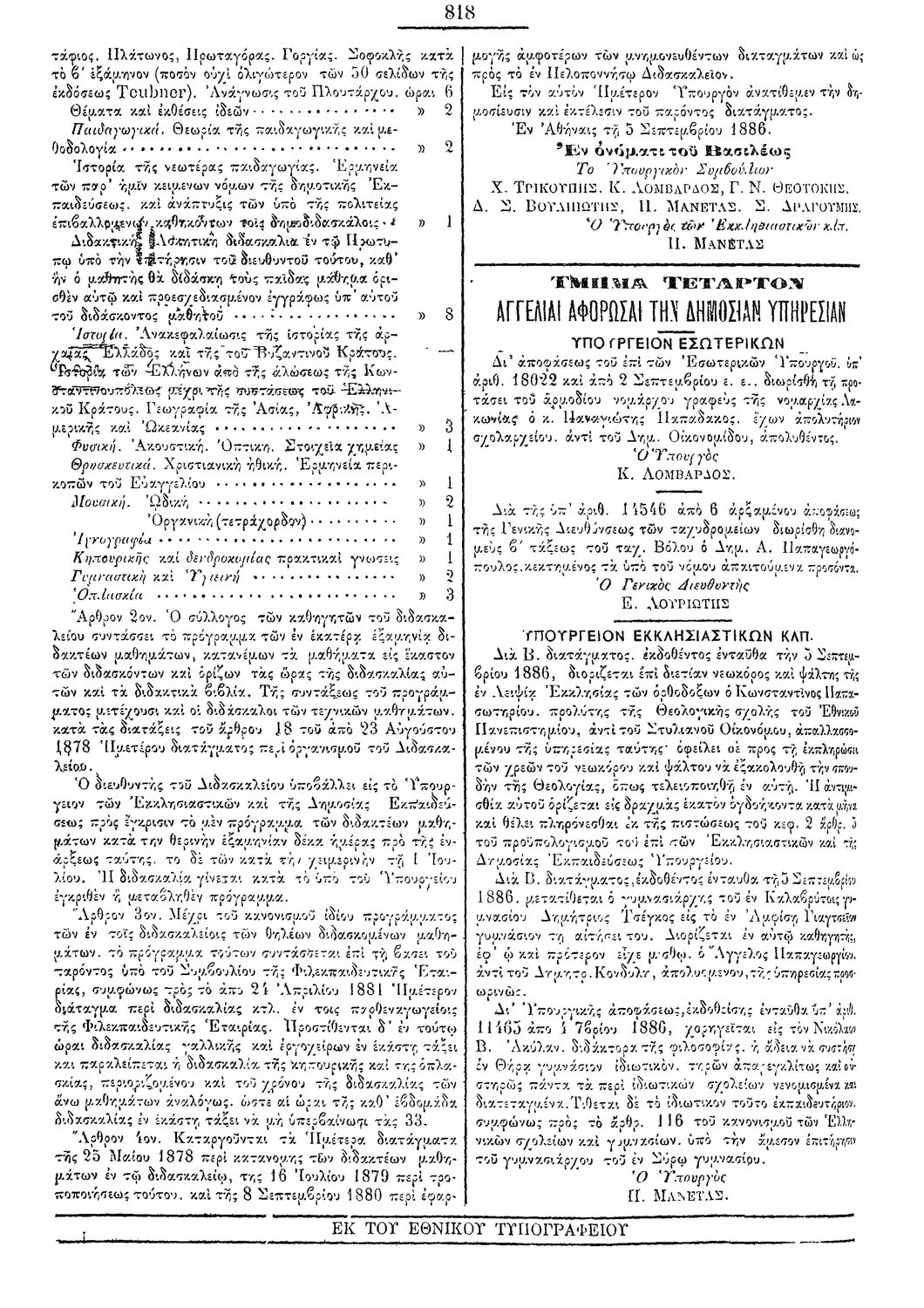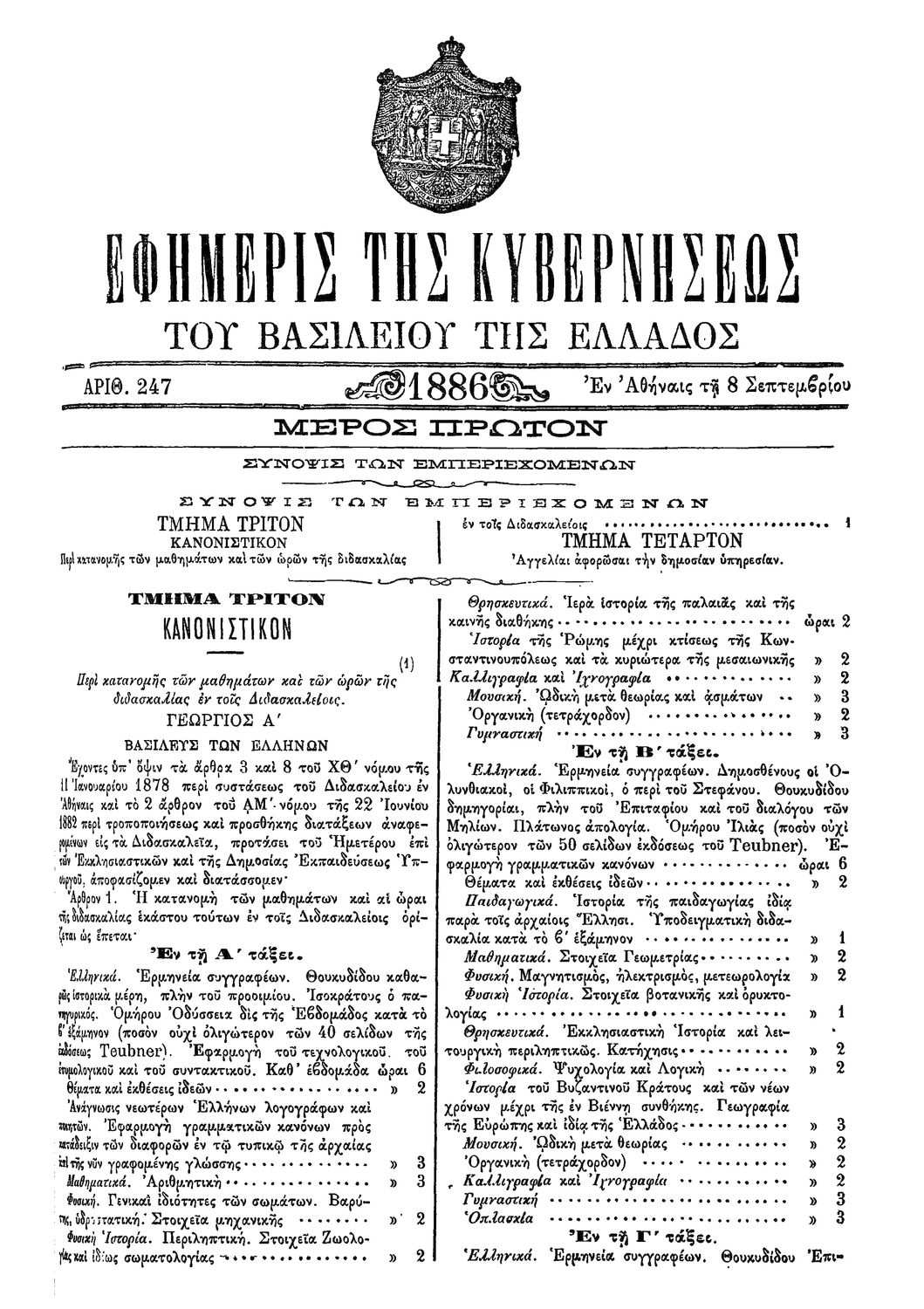 Κωδικός αναγνώρισης: 1886-247A Τίτλος: ΦΕΚ 247/08.09.1886, Τεύχος Α Μέγεθος και υπόστρωμα: Φεκ προγραμμάτων σπουδών, 2 σελίδες. |