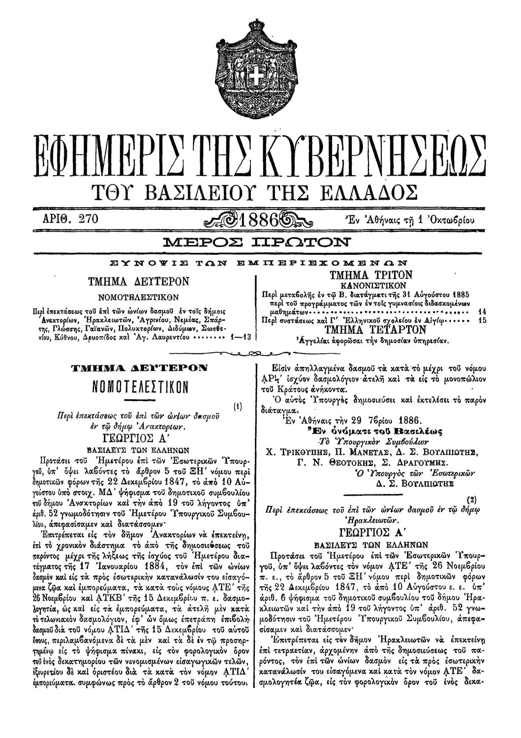 Κωδικός αναγνώρισης: 1886-270A Τίτλος: ΦΕΚ 270/01.10.1886, Τεύχος Α Μέγεθος και υπόστρωμα: Φεκ προγραμμάτων σπουδών, 2 σελίδες. |