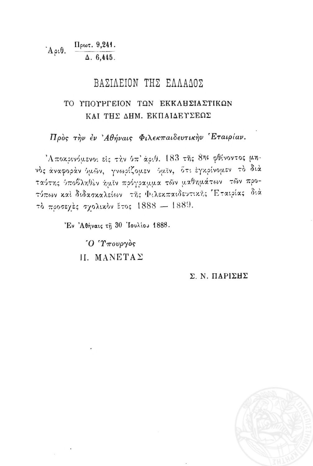 Τίτλος: Πρακτικά της εν Αθήναις Φιλεκπαιδευτικής Εταιρίας του έτους 1887-1888