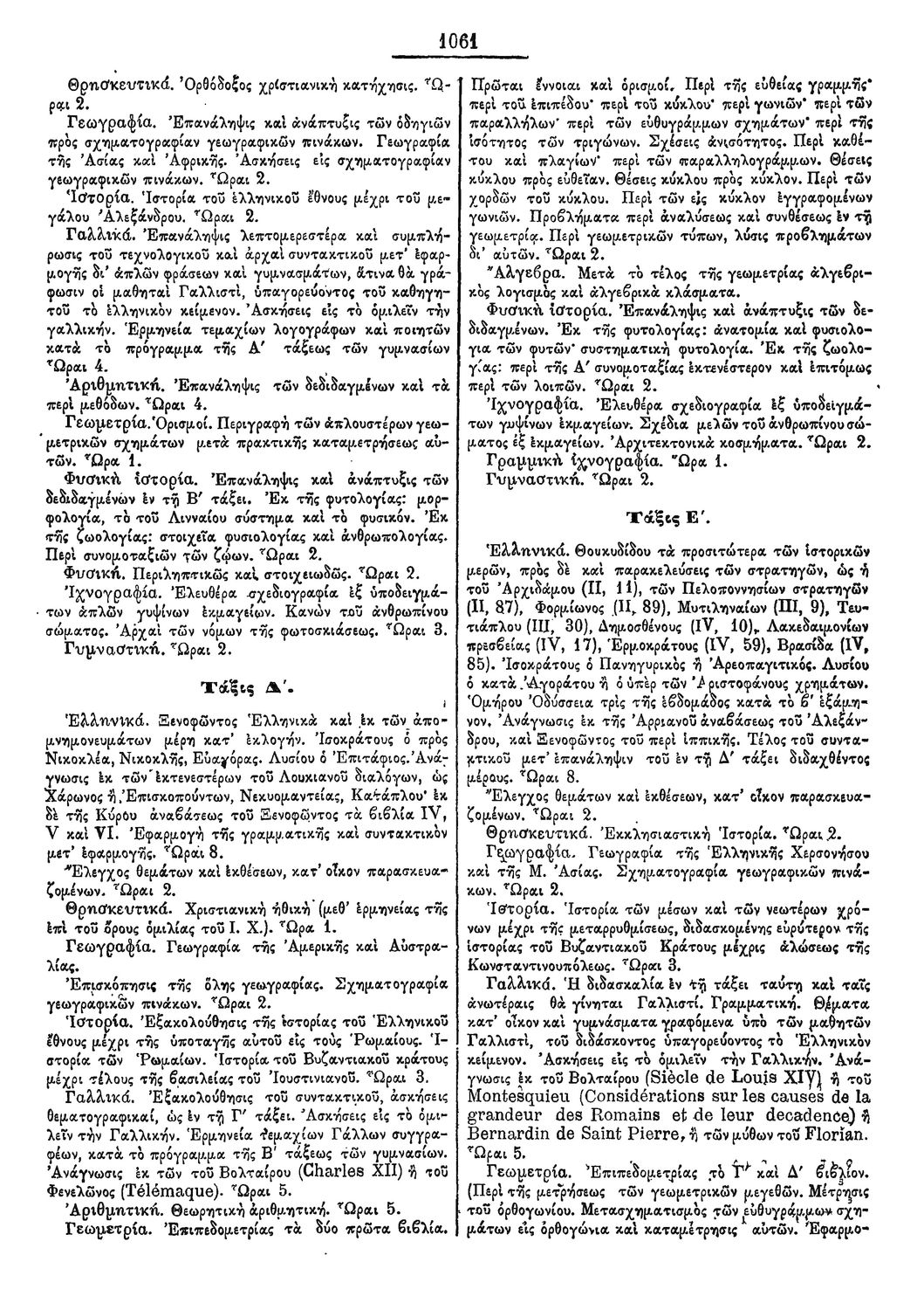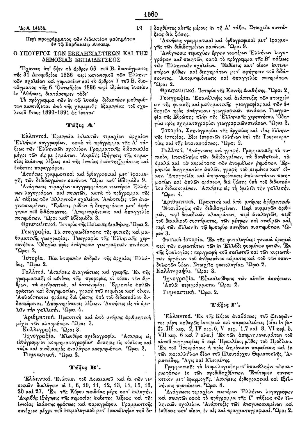 Υ.Α. 14454 Περί προγράμματος των διδακτέων μαθημάτων εν τω Βαρβακείω Λυκείω