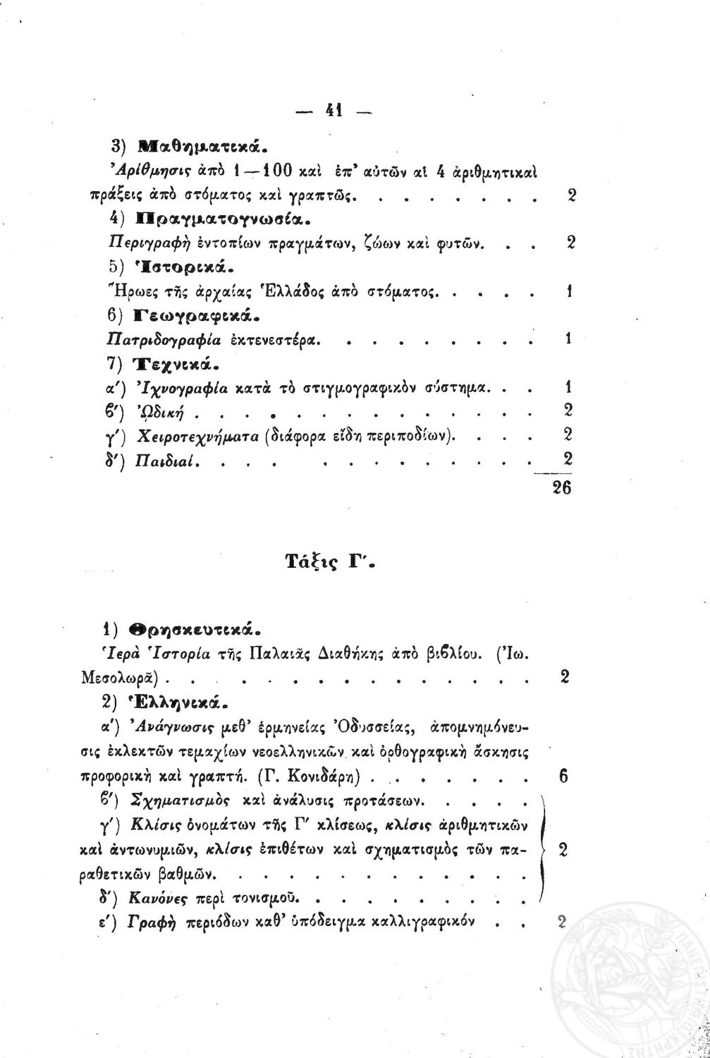 Κ.Δ. Περί του ωρολογίου προγράμματος των εν τοις γυμνασίοις παλαιού τύπου και τοις πρακτικοίς Λυκείοις διδασκομένων μαθημάτων κατά το σχολ. έτος 1941-42