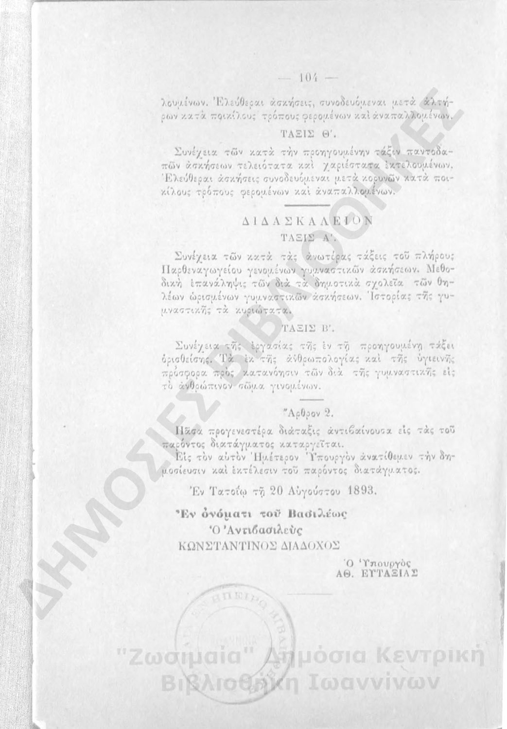 Διόρθωσις ημαρτημένων εν τω τοις 20 Αυγούστου 1893 Β. Δ Περί ωρολογίου και αναλυτικού προγράμματος των μαθημάτων των πλήρων παρθεναγωγείων και των διδασκαλείων των θηλέων