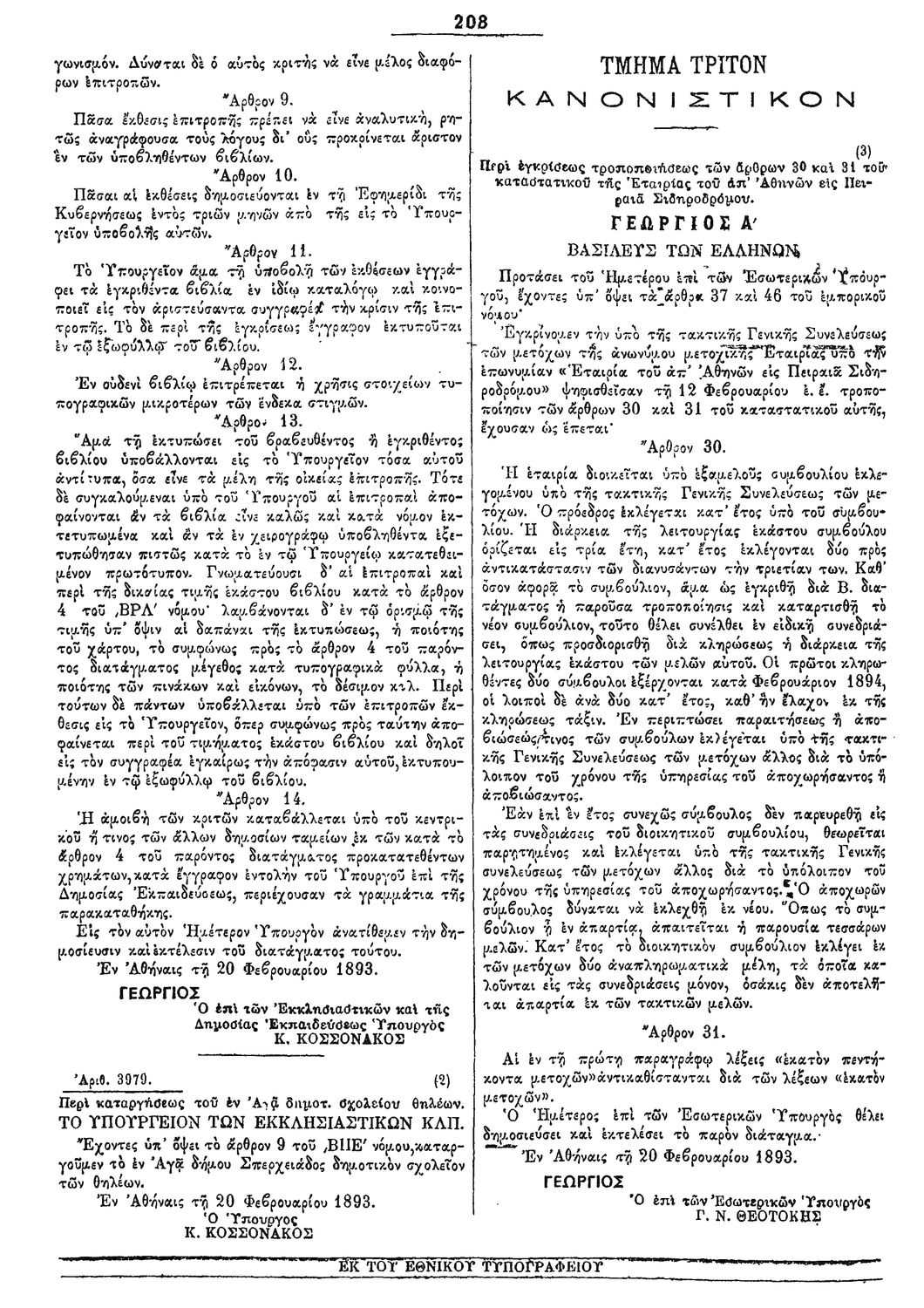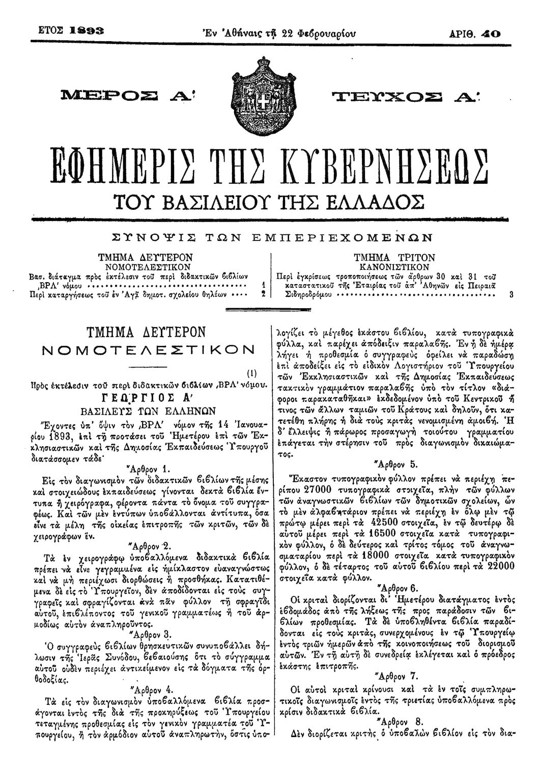 Κωδικός αναγνώρισης: 1893-040A Τίτλος: ΦΕΚ 40/22.02.1893, Τεύχος Α Μέγεθος και υπόστρωμα: Φεκ προγραμμάτων σπουδών, 2 σελίδες. |
