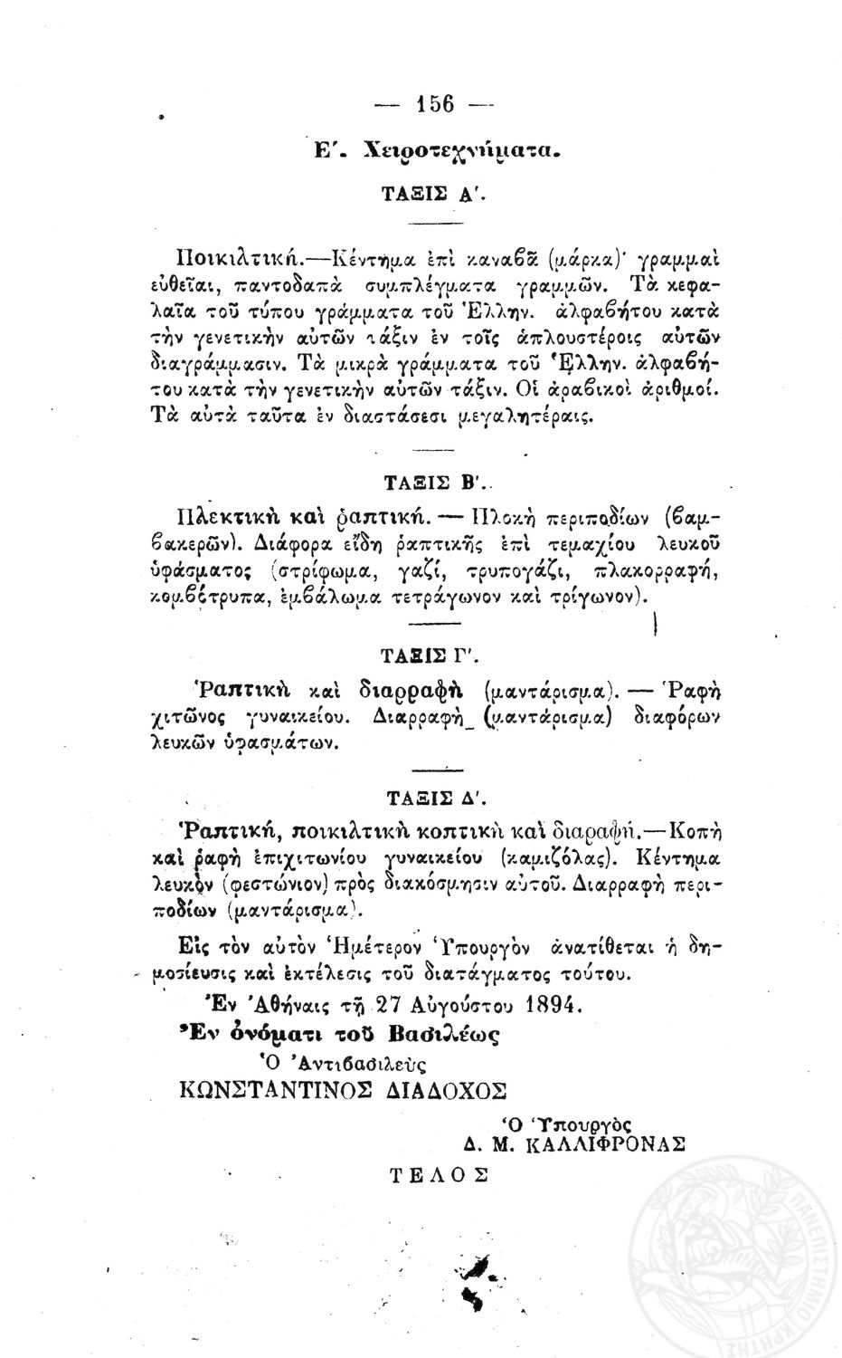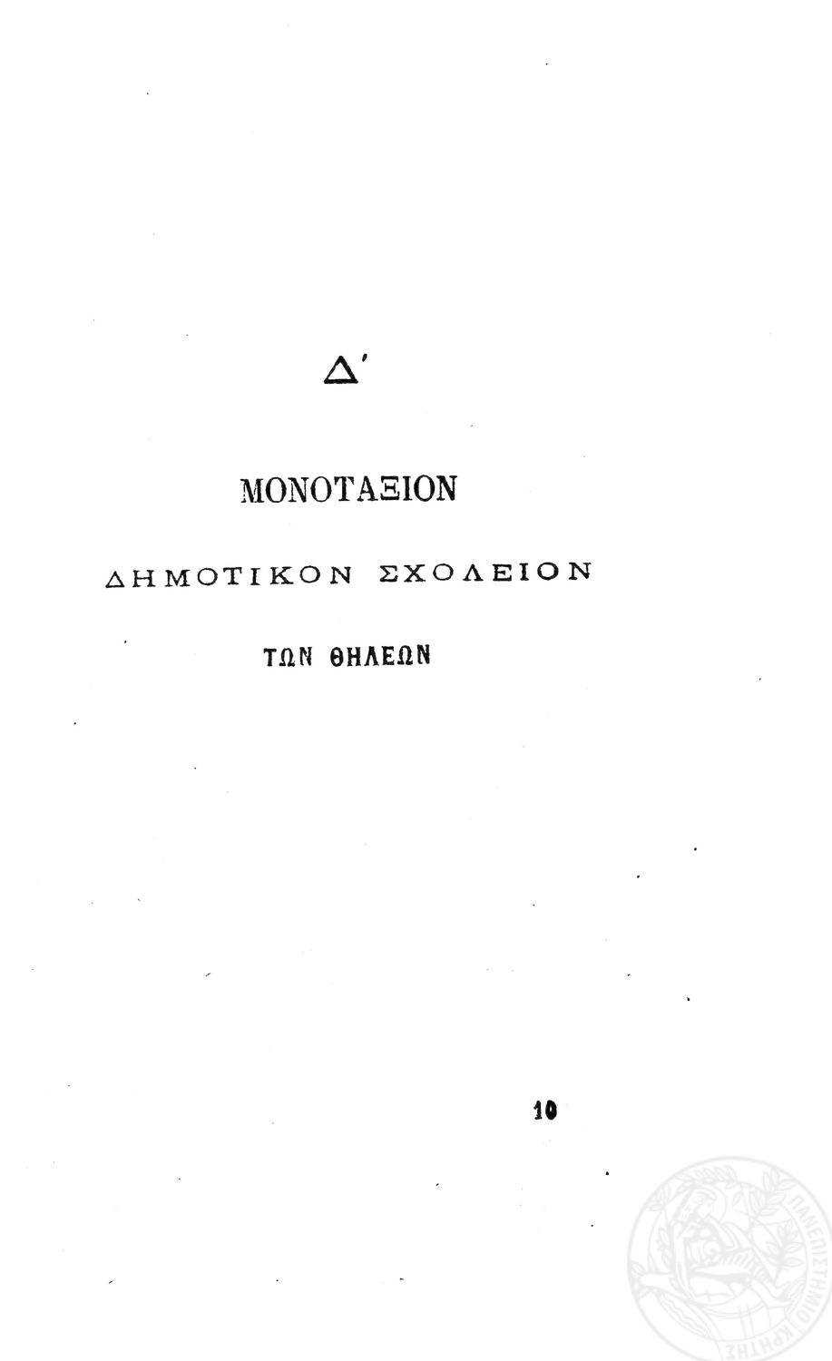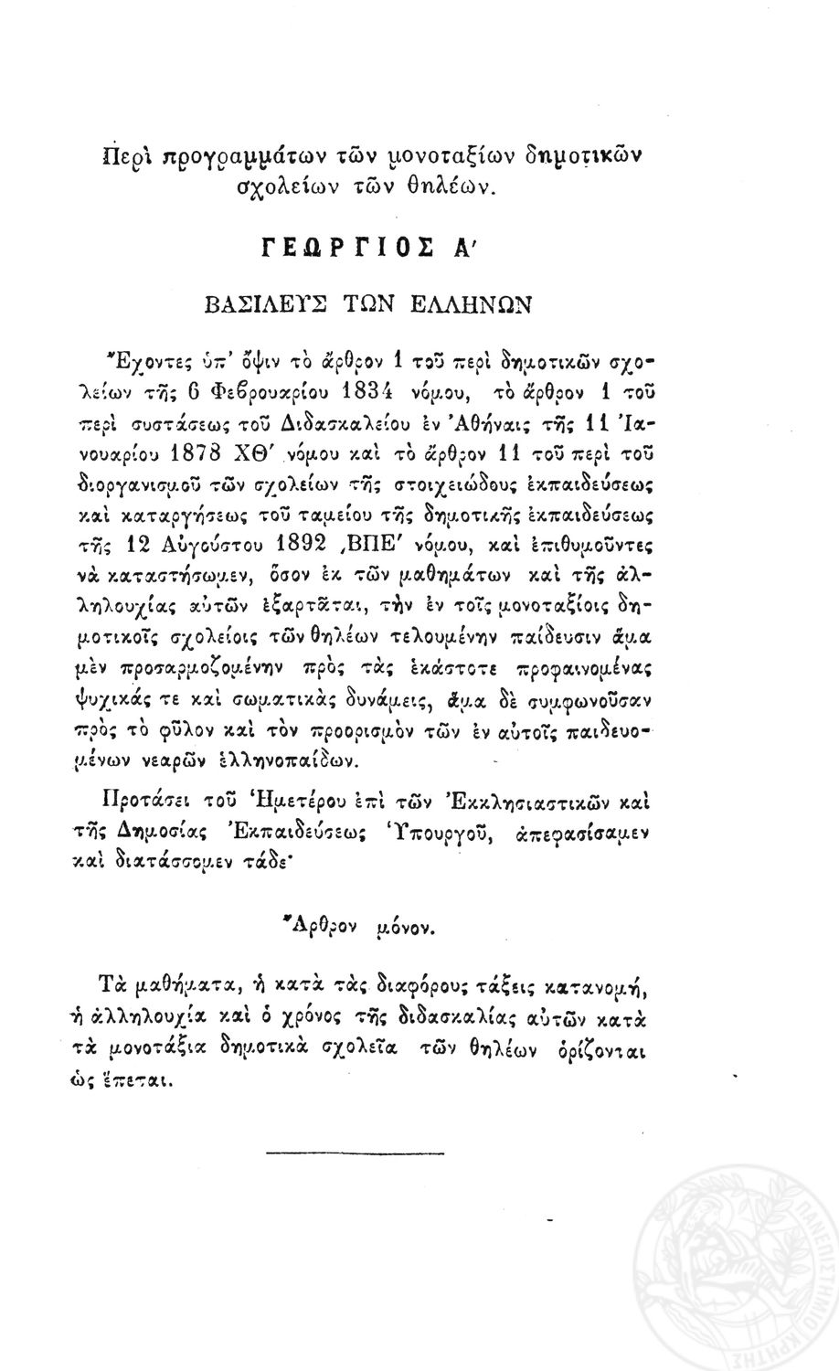 Β.Δ. Περί προγραμμάτων των μονοταξίων δημοτικών σχολείων των θηλέων