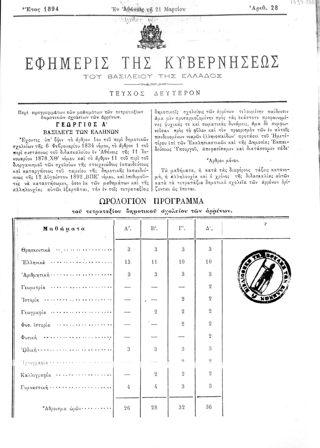 Κωδικός αναγνώρισης: 1894-028B Τίτλος: ΦΕΚ 28/12.03.1894, Τεύχος Β Μέγεθος και υπόστρωμα: Φεκ προγραμμάτων σπουδών, 13 σελίδες. |