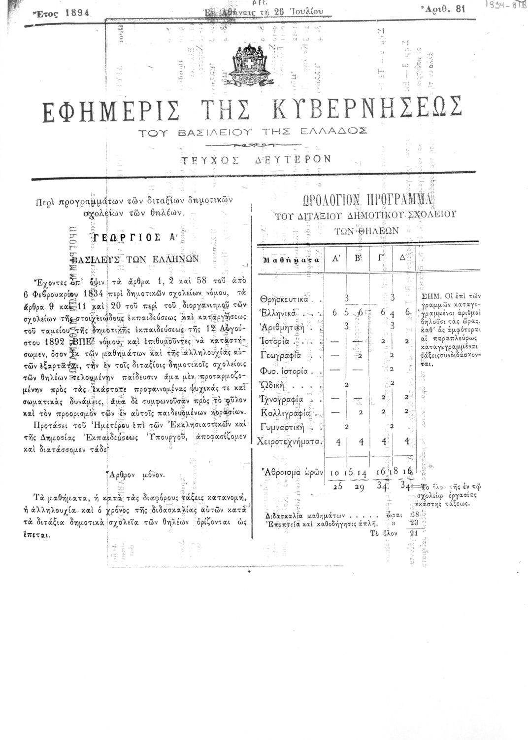 Κωδικός αναγνώρισης: 1894-081B Τίτλος: ΦΕΚ 81/09.08.1894, Τεύχος Β Μέγεθος και υπόστρωμα: Φεκ προγραμμάτων σπουδών, 12 σελίδες. |
