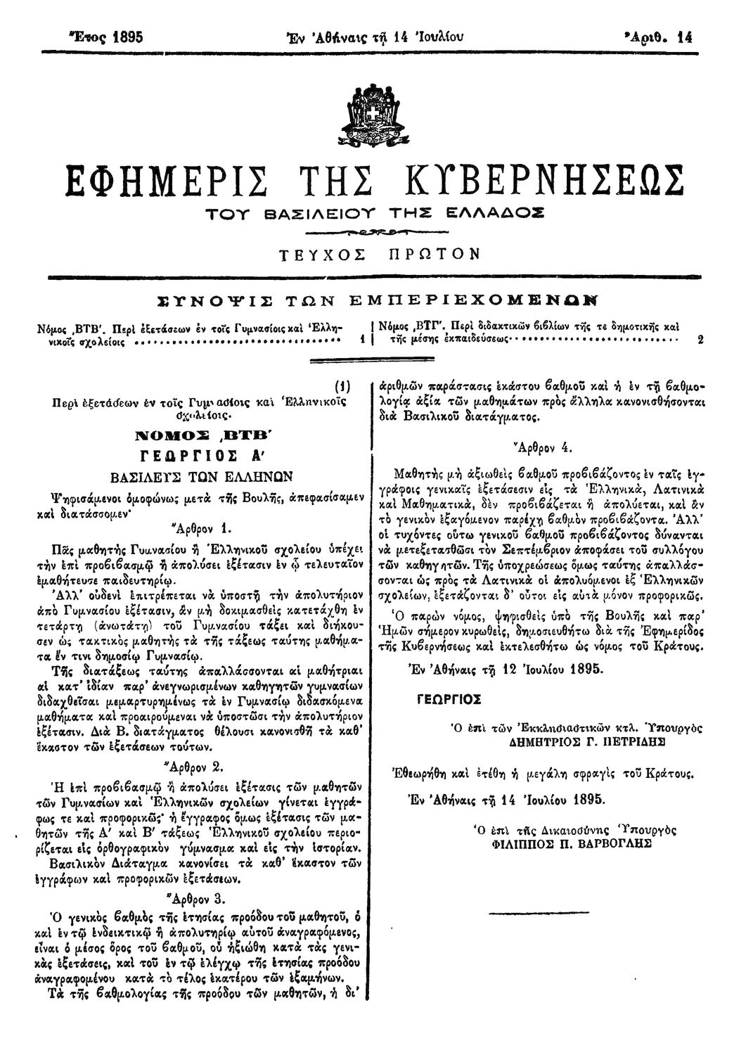 Κωδικός αναγνώρισης: 1895-014A Τίτλος: ΦΕΚ 14/14.07.1895, Τεύχος Α Μέγεθος και υπόστρωμα: Φεκ προγραμμάτων σπουδών, 4 σελίδες. |