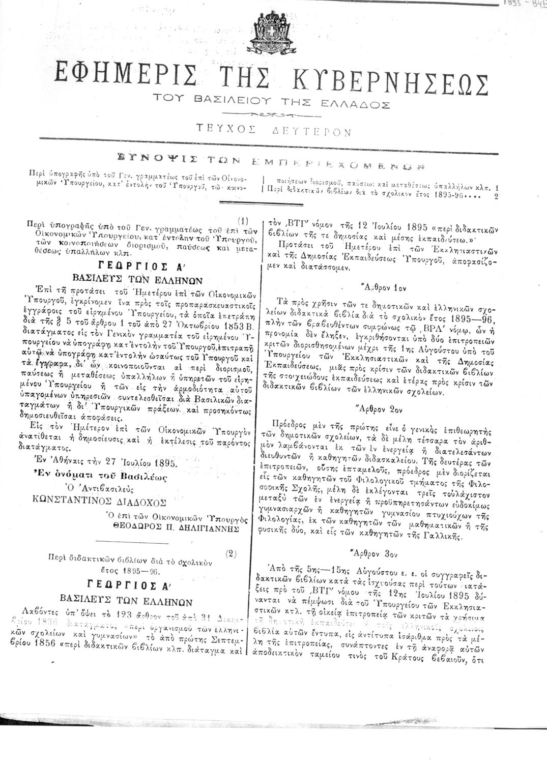 Β.Δ. Περί διδακτικών βιβλίων διά το σχολικόν έτος 1895-96.