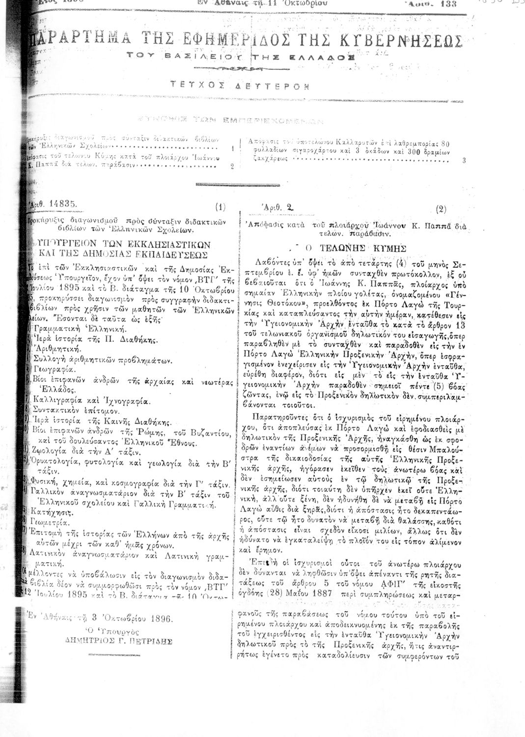 Κωδικός αναγνώρισης: 1896-133B Τίτλος: ΦΕΚ 133/11.10.1896, Τεύχος Β Μέγεθος και υπόστρωμα: Φεκ προγραμμάτων σπουδών, 1 σελίδες. |