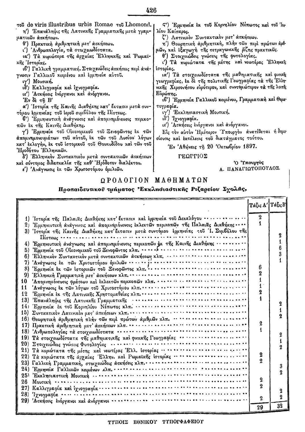 Περί συμπληρώσεως του από 9 Σεπτεμβρίου 1897 οργανισμού της Εκκλησιαστικής Ριζαρείου Σχολής