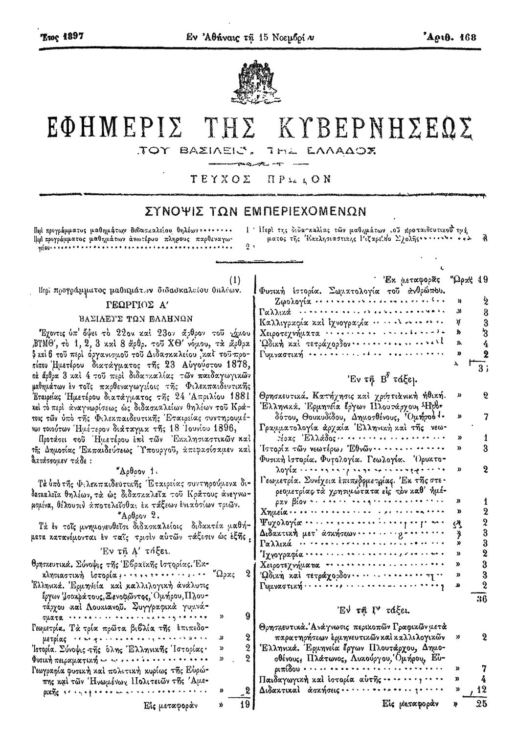 Κωδικός αναγνώρισης: 1897-168A Τίτλος: ΦΕΚ 168/15.11.1897, Τεύχος Α Μέγεθος και υπόστρωμα: Φεκ προγραμμάτων σπουδών, 4 σελίδες. |