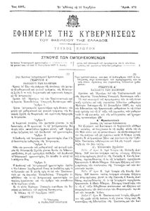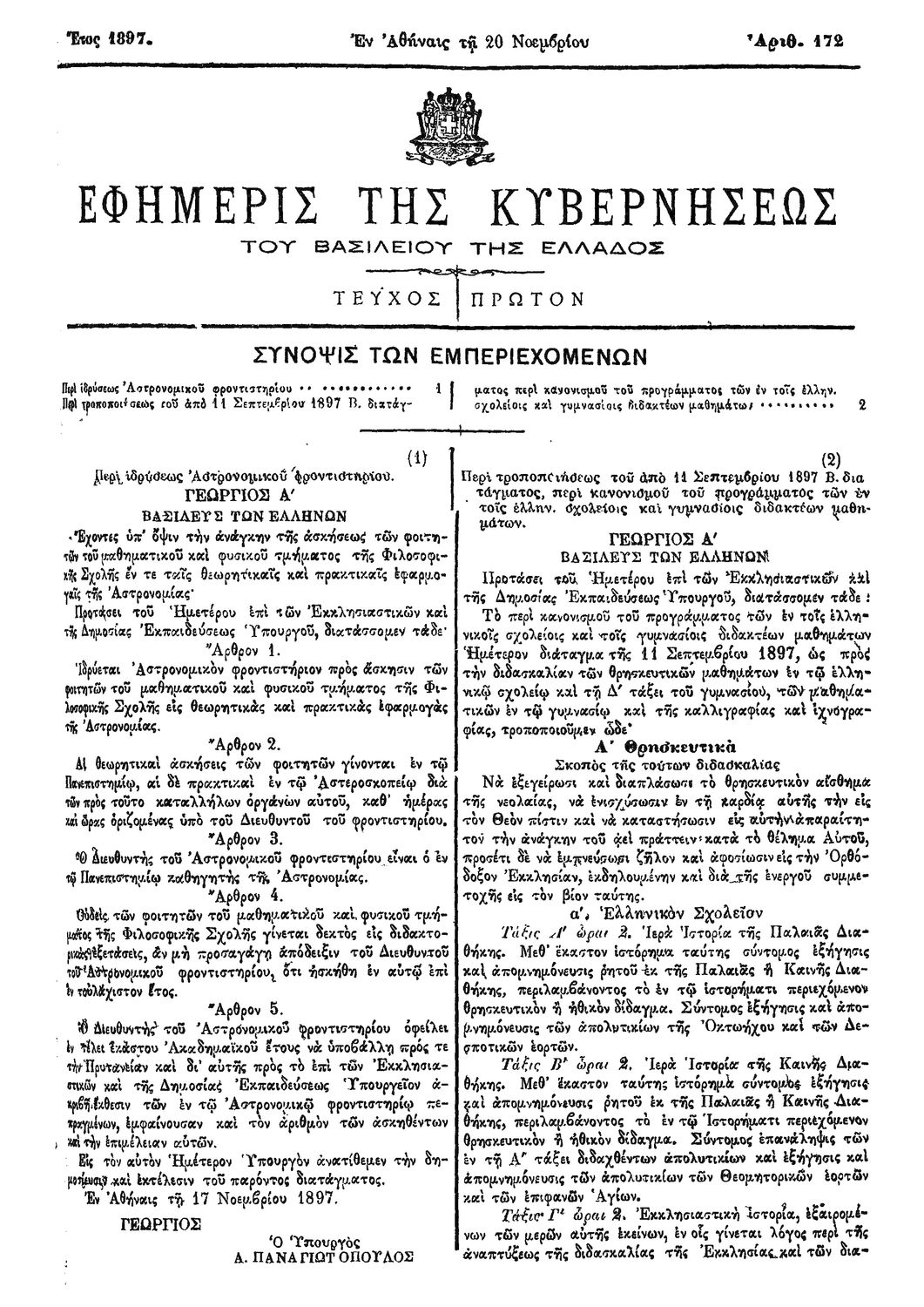 Κωδικός αναγνώρισης: 1897-172A Τίτλος: ΦΕΚ 172/20.11.1897, Τεύχος Α Μέγεθος και υπόστρωμα: Φεκ προγραμμάτων σπουδών, 2 σελίδες. |
