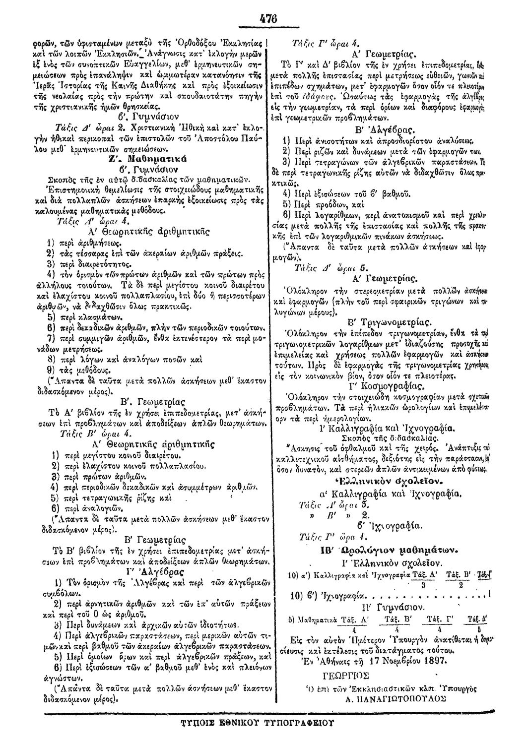 Β.Δ. Περί τροποποιήσεως του από 11 Σεπτεμβρίου 1897 Β. διατάγματος, περί κανονισμού του προγράμματος των εν τοις ελλην. σχολείοις και γυμνασίοις διδακτέων μαθημάτων