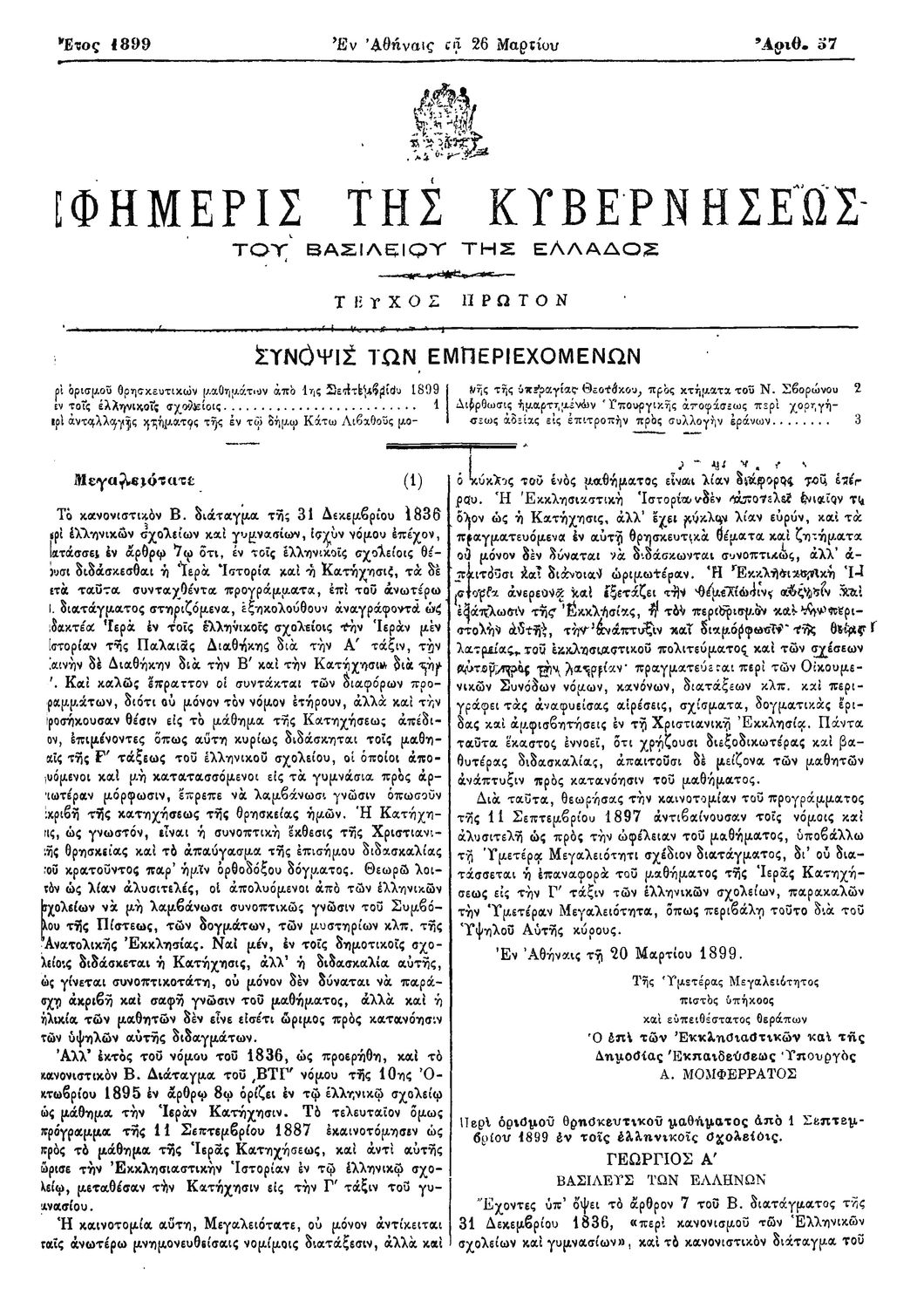 Περί ορισμού θρησκευτικών μαθημάτων από 1ης Σεπτεμβρίου 1899 εν τοις ελληνικής σχολείοις