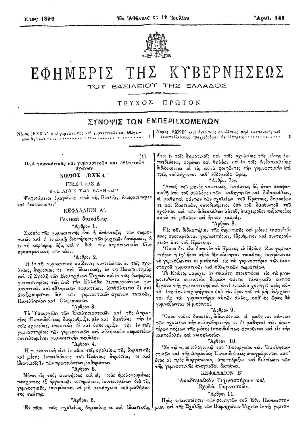 Νόμος ΒΧΚΑ' Περί γυμναστικής και γυμναστικών και αθλητικών αγώνων