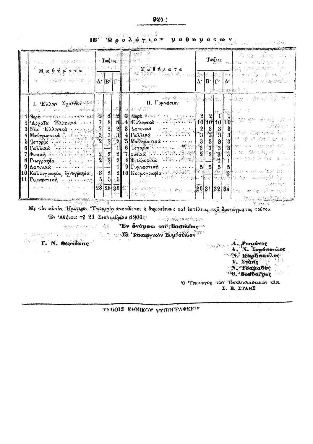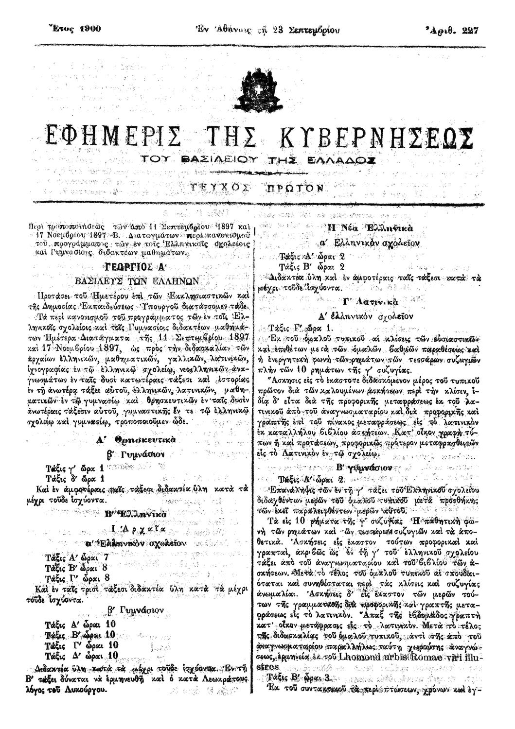 Περί τροποποιήσεως των από 11 Σεπτεμβρίου 1897 και 17 Νοεμβρίου 1897 Β. Διαταγμάτων περί κανονισμού του προγράμματος των εν τοις Ελληνικοίς Σχολείοις και Γυμνασίοις διδακτέων μαθημάτων