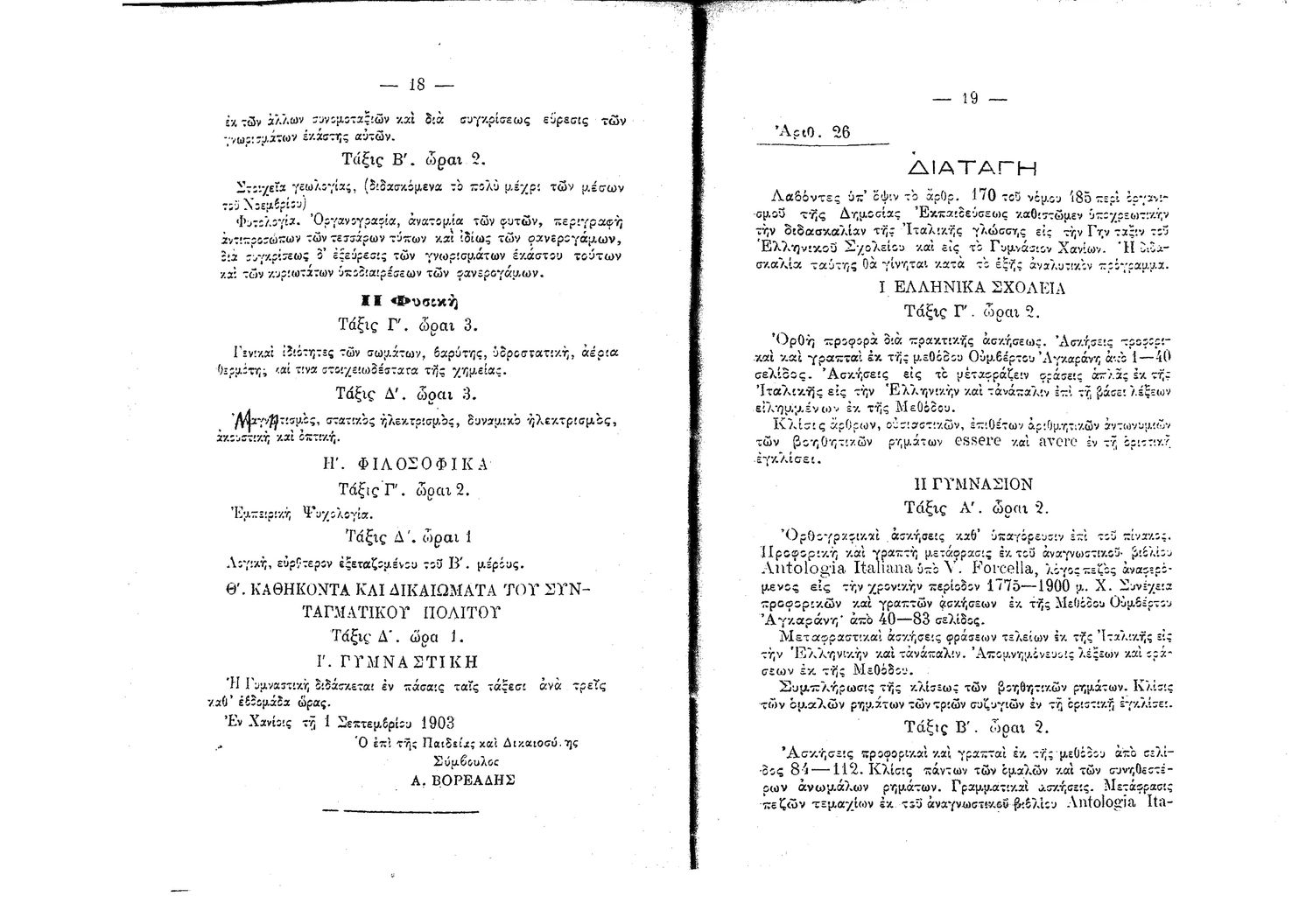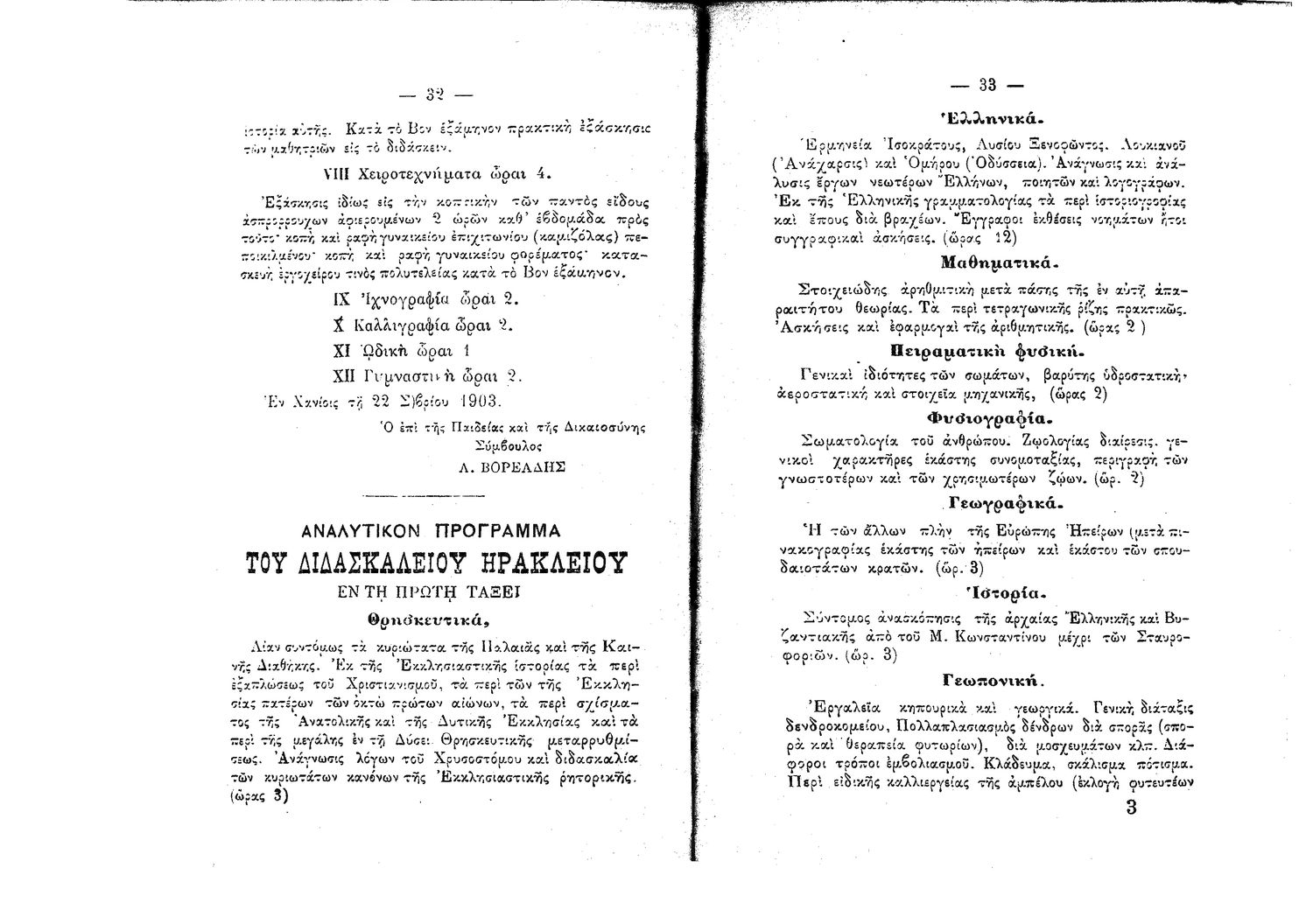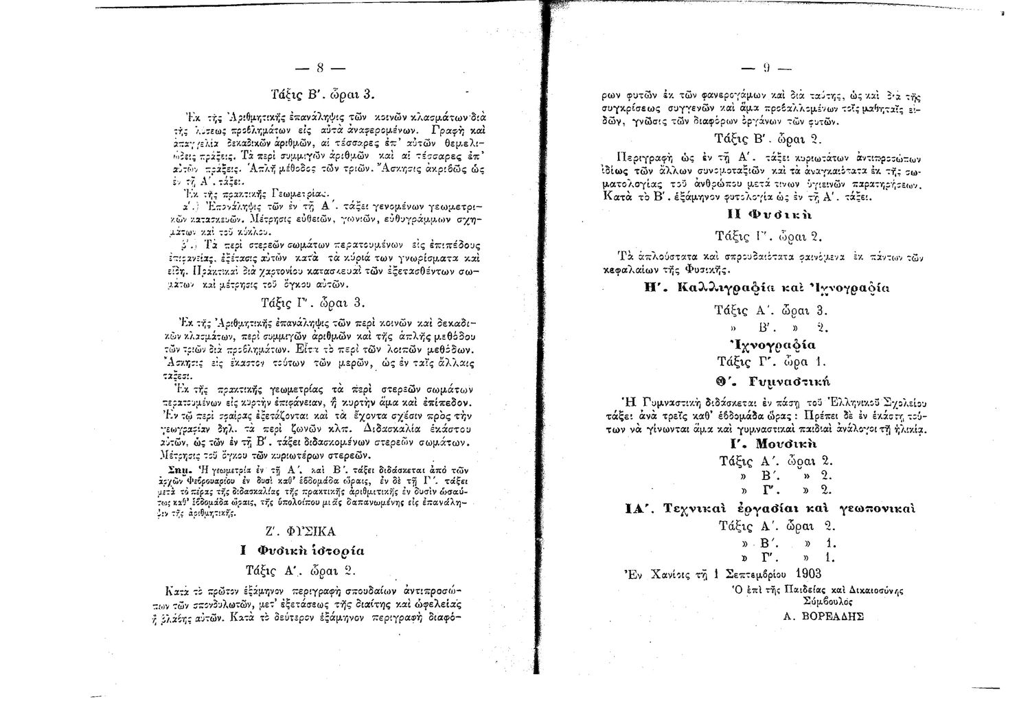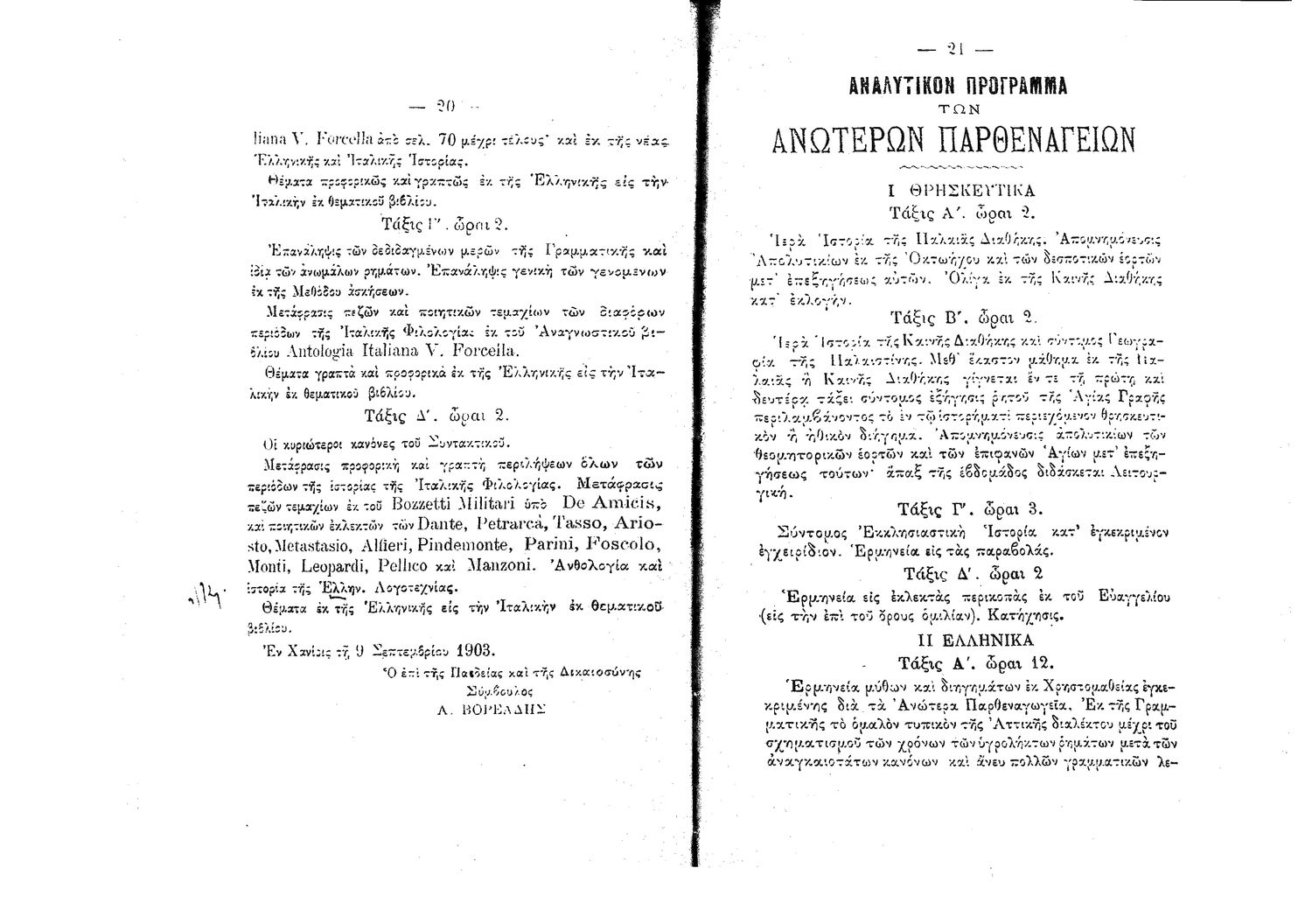 Κωδικός αναγνώρισης: 1903-0022 Τίτλος: Αναλυτικόν πρόγραμμα των ελληνικών σχολείων, γυμνασίων, ανωτέρων παρθεναγωγείων διδασκαλείου και ιεροδιδασκαλείου Μέγεθος και υπόστρωμα: Λοιπά προγραμμάτων σπουδών, 24 σελίδες. |
