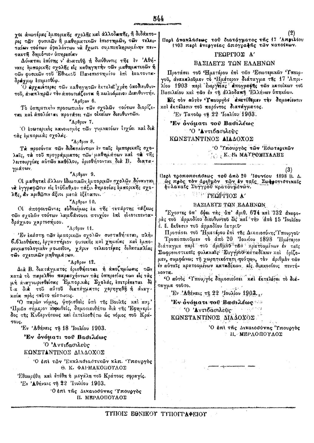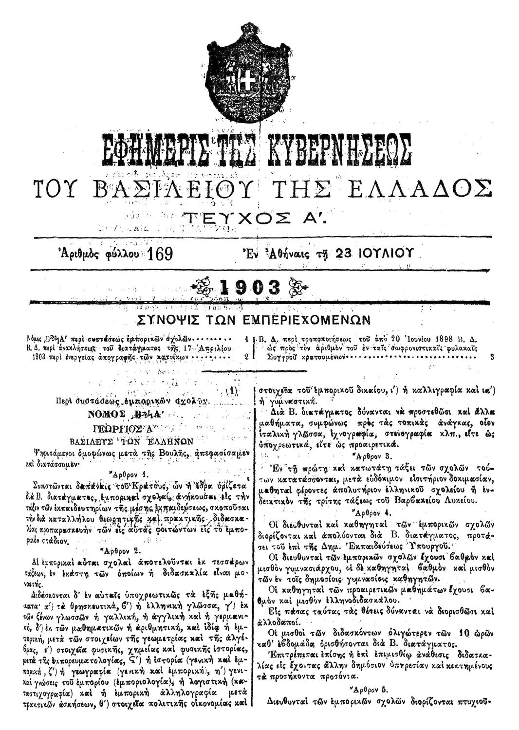 Νόμος ΒϠϞΑ Περί συστάσεως εμπορικών σχολών