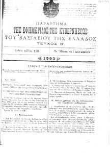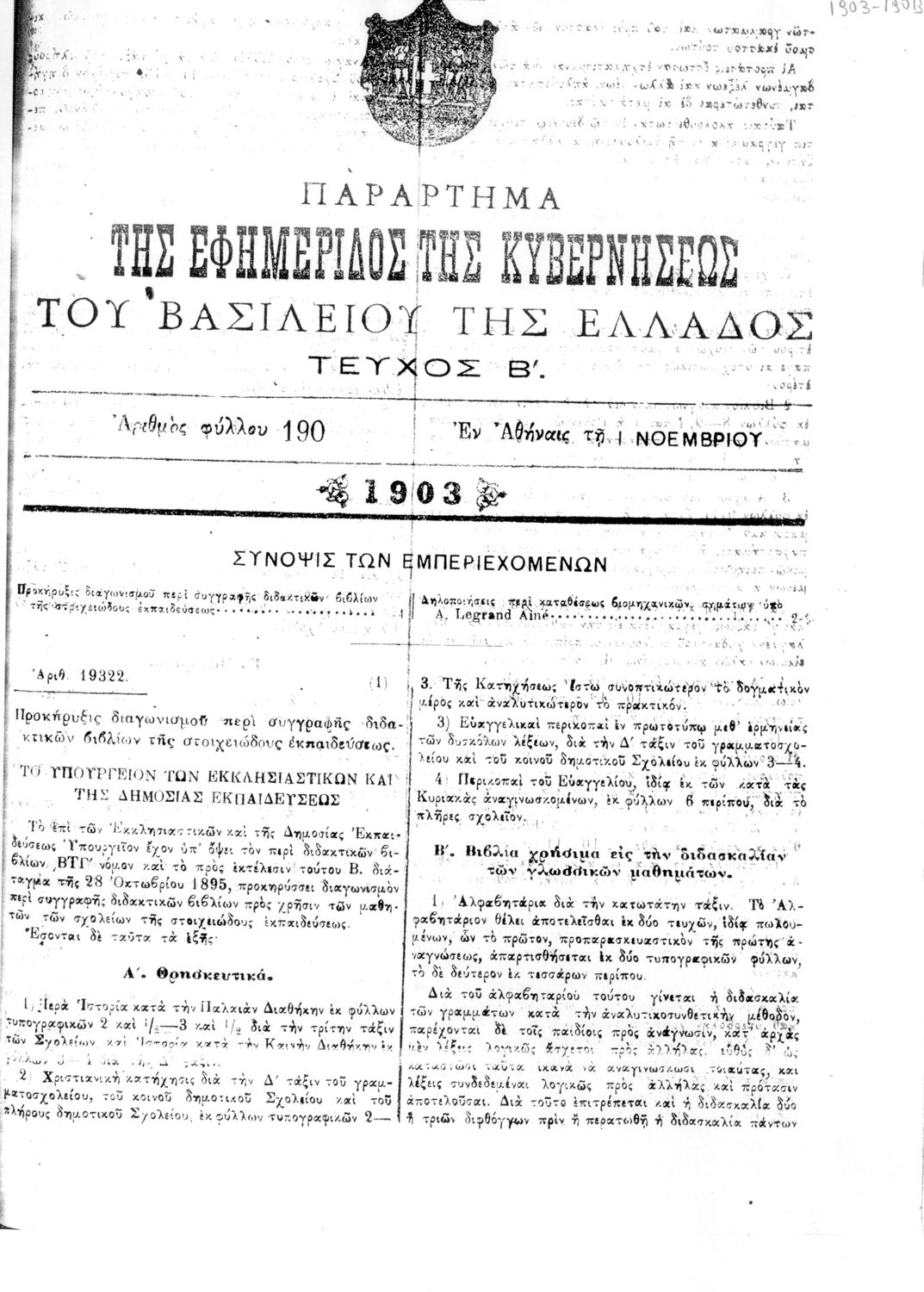 Κωδικός αναγνώρισης: 1903-190B Τίτλος: ΦΕΚ 190/01.11.1903, Τεύχος Β Μέγεθος και υπόστρωμα: Φεκ προγραμμάτων σπουδών, 3 σελίδες. |
