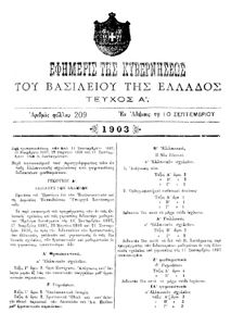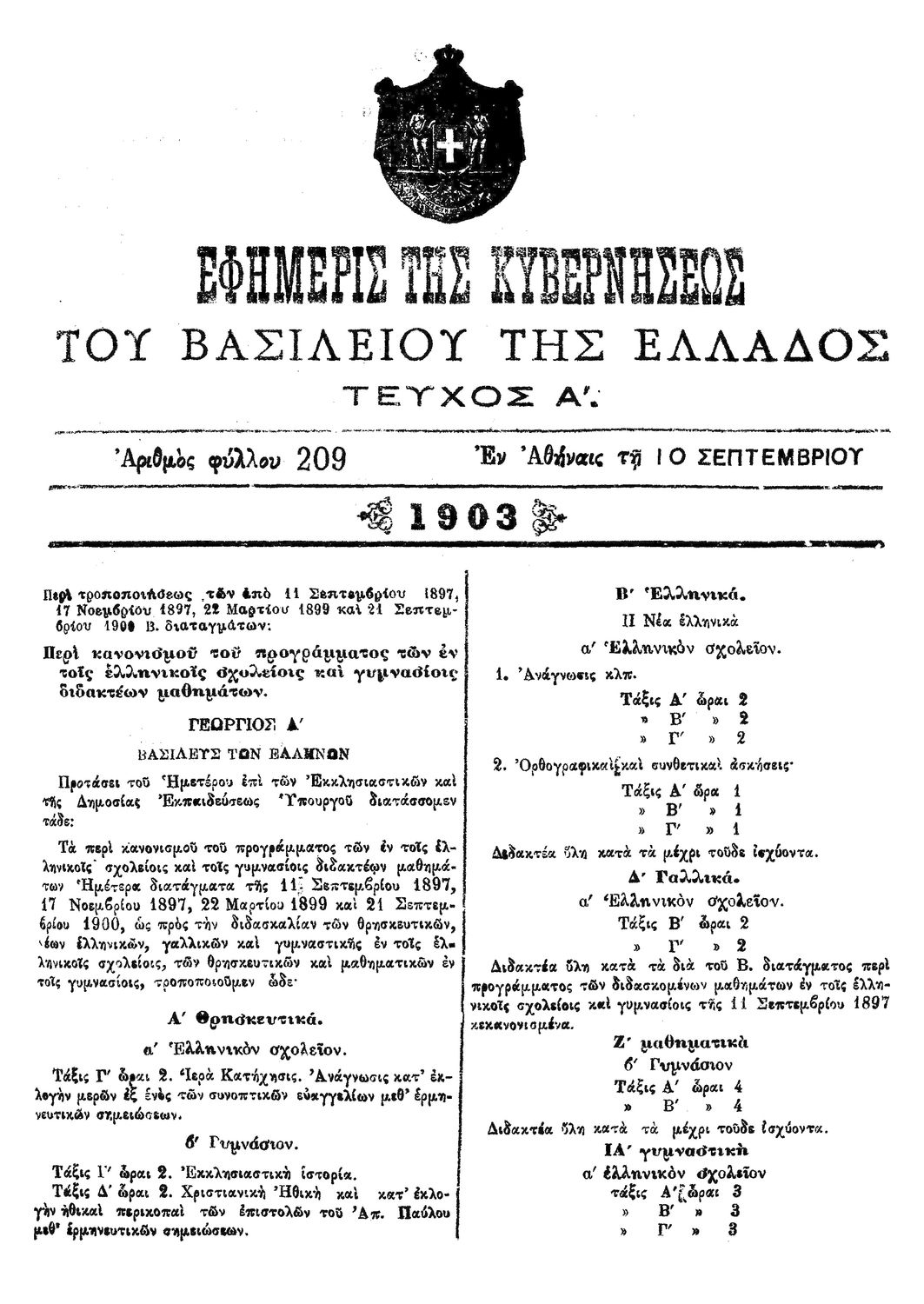 Κωδικός αναγνώρισης: 1903-209A Τίτλος: ΦΕΚ 209/10.09.1903, Τεύχος Α Μέγεθος και υπόστρωμα: Φεκ προγραμμάτων σπουδών, 2 σελίδες. |