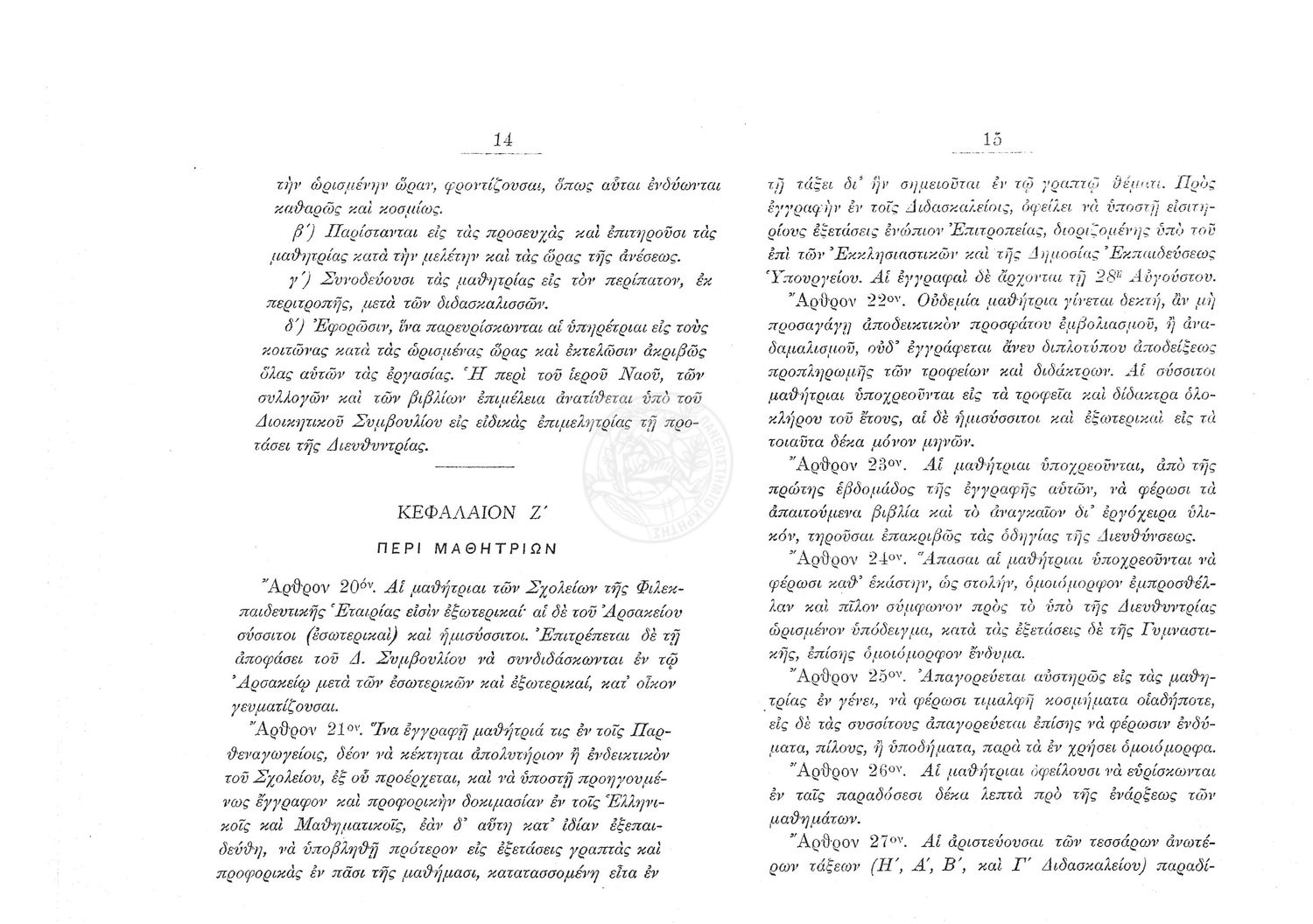 Κωδικός αναγνώρισης: 1904-0024 Τίτλος: Κανονισμός των σχολείων της εν Αθήναις Φιλεκπαιδευτικής Εταιρίας Μέγεθος και υπόστρωμα: Λοιπά προγραμμάτων σπουδών, 23 σελίδες. |