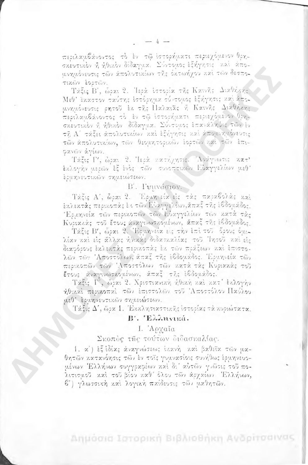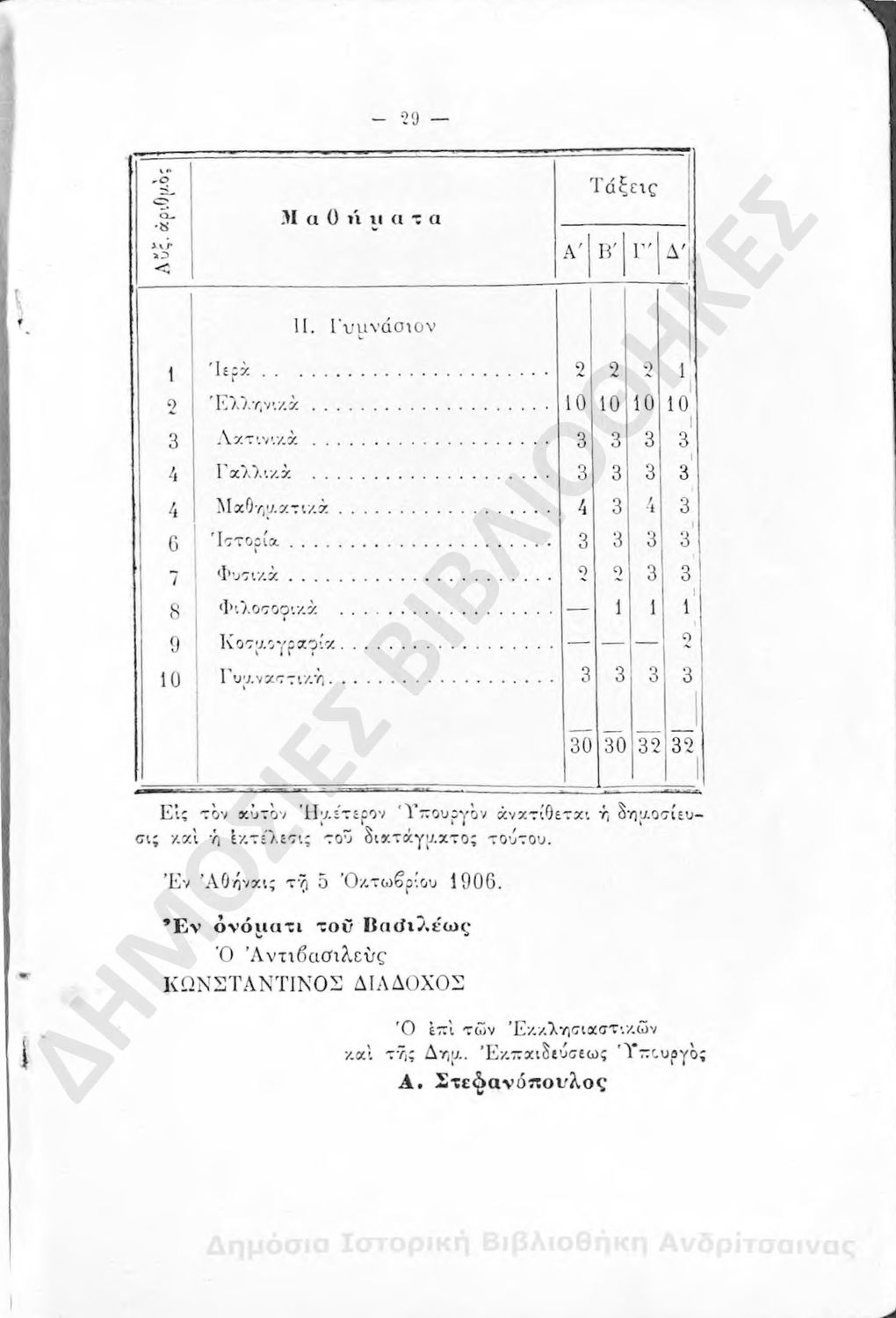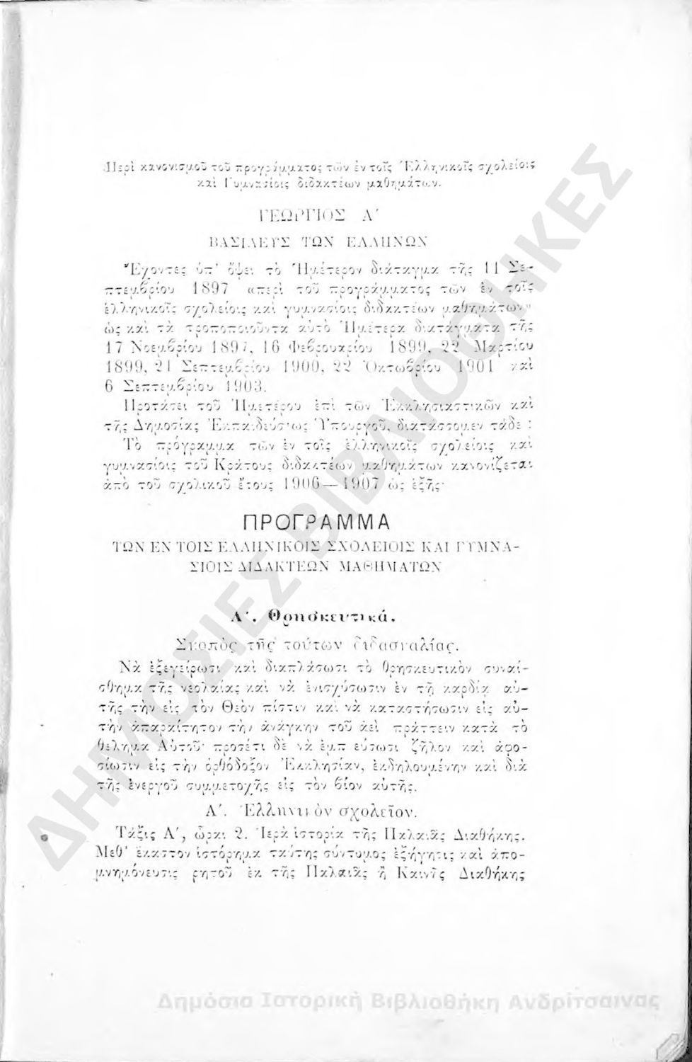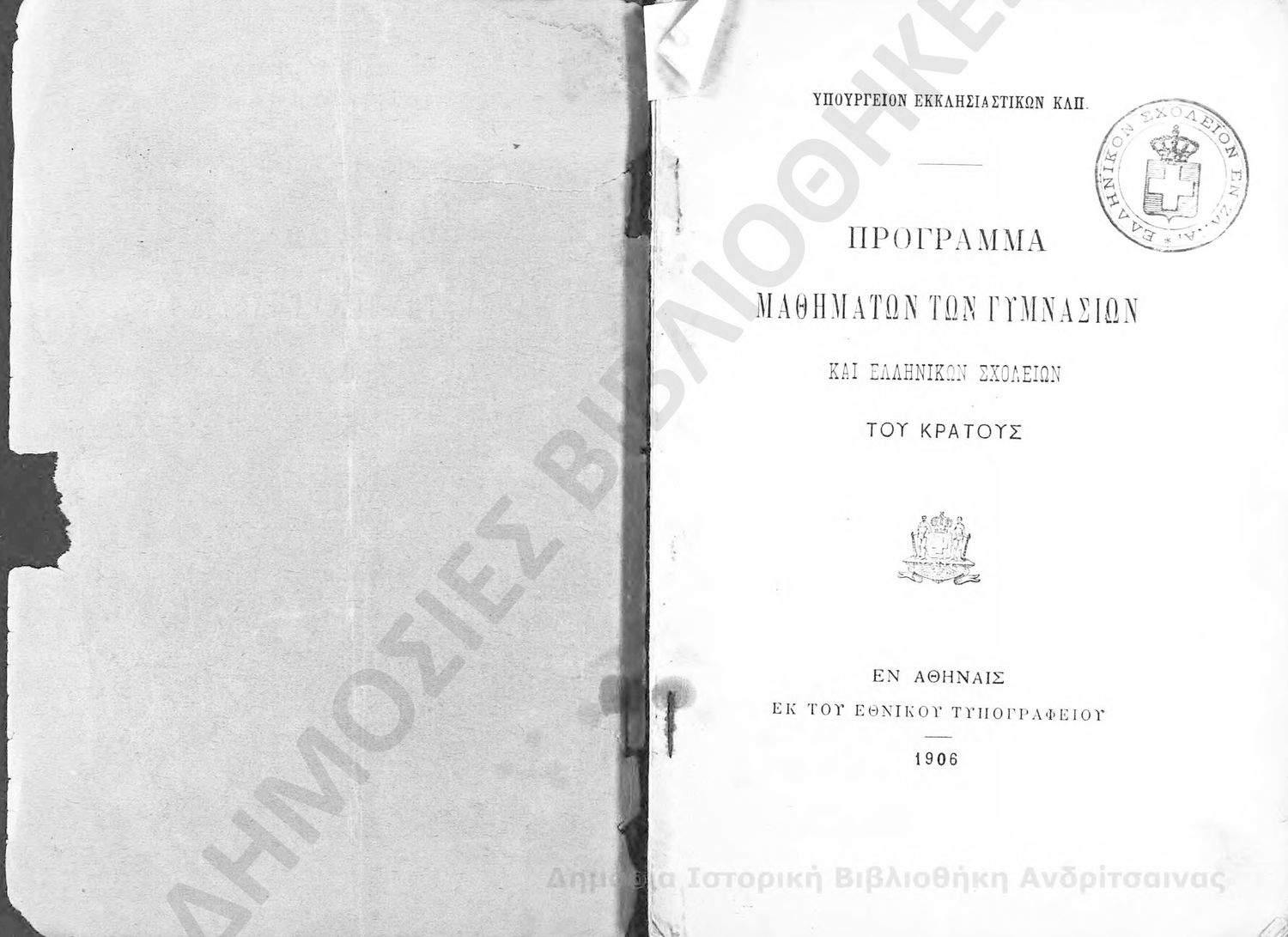 Κωδικός αναγνώρισης: 1906-0028 Τίτλος: Πρόγραμμα μαθημάτων των Γυμνασίων και Ελληνικών σχολείων του κράτους Μέγεθος και υπόστρωμα: Λοιπά προγραμμάτων σπουδών, 31 σελίδες. |
