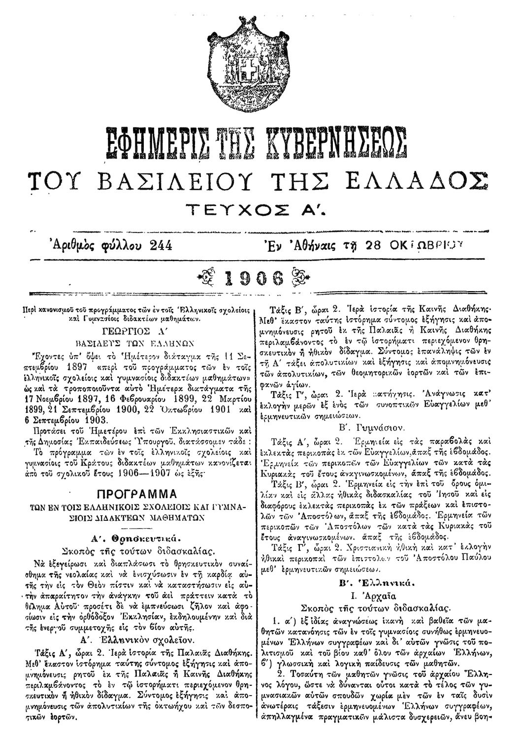 Κωδικός αναγνώρισης: 1906-244A Τίτλος: ΦΕΚ 244/28.10.1906, Τεύχος A Μέγεθος και υπόστρωμα: Φεκ προγραμμάτων σπουδών, 8 σελίδες. |