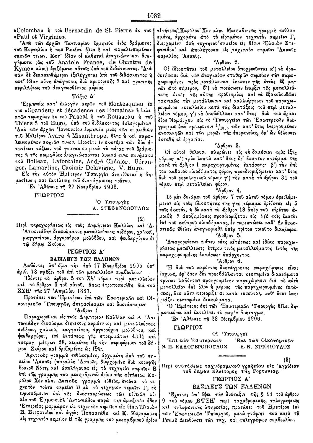 Β.Δ. Περί συμπληρώσεως του από 5 Οκτωβρίου 1906 Β.Δ. "περί κανονισμού του προγράμματος των εν τοις ελληνικοίς σχολείοις και γυμνασίοις διδακτέων μαθημάτων” ως προς την διδασκαλίαν των θρησκευτικών και γαλλικών εν τω γυμνασίω
