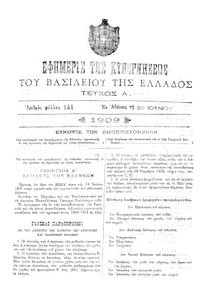 Κωδικός αναγνώρισης: 1909-144A Τίτλος: ΦΕΚ 144/30.06.1909, Τεύχος Α Μέγεθος και υπόστρωμα: Φεκ προγραμμάτων σπουδών, 16 σελίδες. |